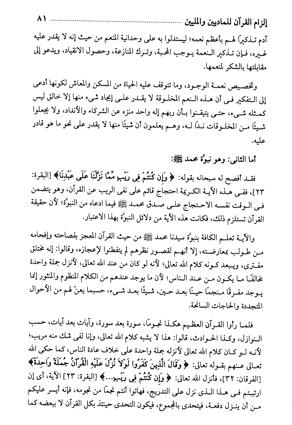 والآية تعلم الكافة بنبوّة سيدنا محمد صلى الله عليه وسلم من حيث القرآن المعجز بفصاحته وإفحامه من طولب بمعارضته، إلا أنهم لقصور نظرهم لم يتفطنوا لإعجازه، وقالوا: إنه مختلق مفترى، ويبعد كونه كلام الله تعالى؛ لأنه لو كان من عند الله تعالى، لأنزل جملة واحدة مخالفا ما يكون من عند الناس؛ لأن ما يوجد عندهم من الكلام المنظوم والمنثور إنما يوجد مفرقا منجما حينا بعد حين، شيئا بعد شىء، حسبما يعنّ لهم من الأحوال المتجددة والحاجات السانحة.