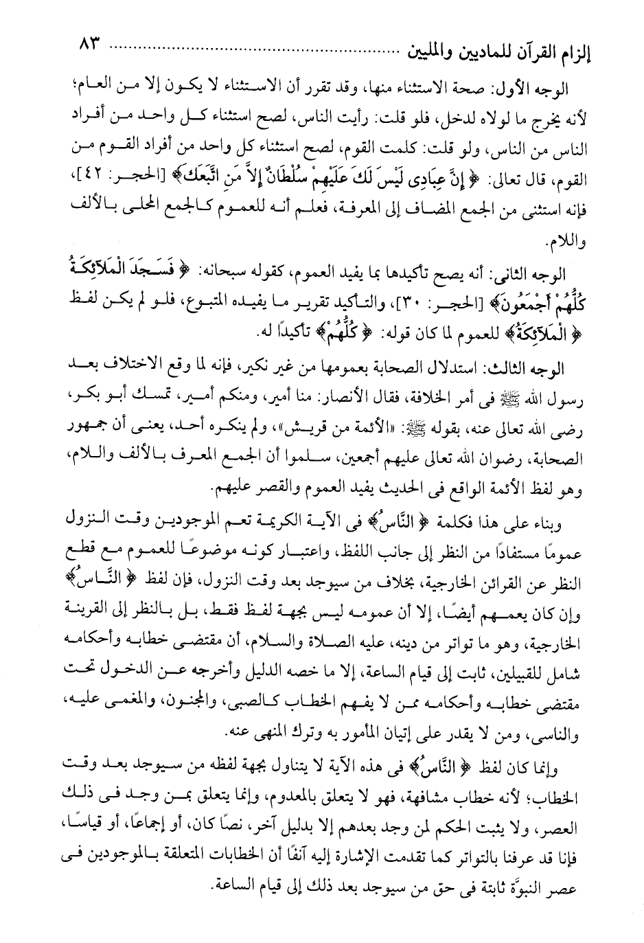 وإنما كان لفظ النَّاسُ فى هذه الآية لا يتناول بجهة لفظه من سيوجد بعد وقت الخطاب؛ لأنه خطاب مشافهة، فهو لا يتعلق بالمعدوم، وإنما يتعلق بمن وجد فى ذلك العصر، ولا يثبت الحكم لمن وجد بعدهم إلا بدليل آخر، نصا كان، أو إجماعا، أو قياسا، فإنا قد عرفنا بالتواتر كما تقدمت الإشارة إليه آنفا أن الخطابات المتعلقة بالموجودين فى عصر النبوّة ثابتة فى حق من سيوجد بعد ذلك إلى قيام الساعة.