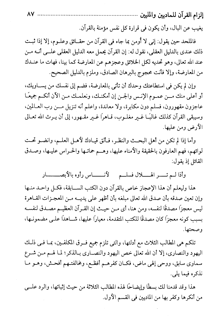 فالملحد حين يقول: إنى لا أومن بما جاء فى القرآن من حقائق وعلوم، إلا إذا ثبت ذلك عندى بالدليل العقلى، نقوله له: إن القرآن يحمل معه الدليل العقلى على أنه من عند الله تعالى، وهو تحديه لكل الخلائق وعجزهم عن المعارضة كما بينا، فهات ما عندك من المعارضة، وإلا فأنت محجوج بالبرهان الصادق، وملزم بالدليل الصحيح.