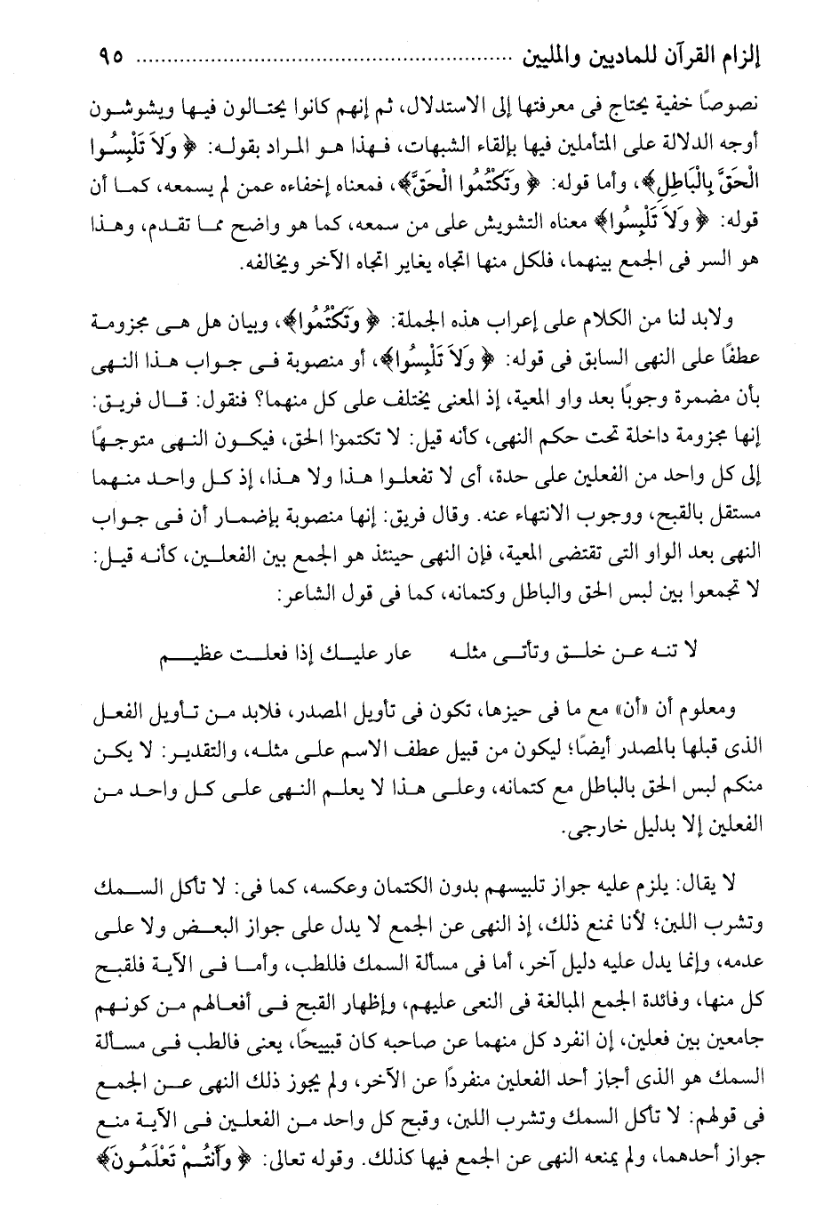 نصوصا خفية يحتاج فى معرفتها إلى الاستدلال، ثم إنهم كانوا يحتالون فيها ويشوشون أوجه الدلالة على المتأملين فيها بإلقاء الشبهات، فهذا هو المراد بقوله: وَلا تَلْبِسُوا الْحَقَّ بِالْباطِلِ، وأما قوله: وَتَكْتُمُوا الْحَقَّ، فمعناه إخفاءه عمن لم يسمعه، كما أن قوله: وَلا تَلْبِسُوا معناه التشويش على من سمعه، كما هو واضح مما تقدم، وهذا هو السر فى الجمع بينهما، فلكل منها اتجاه يغاير اتجاه الآخر ويخالفه.