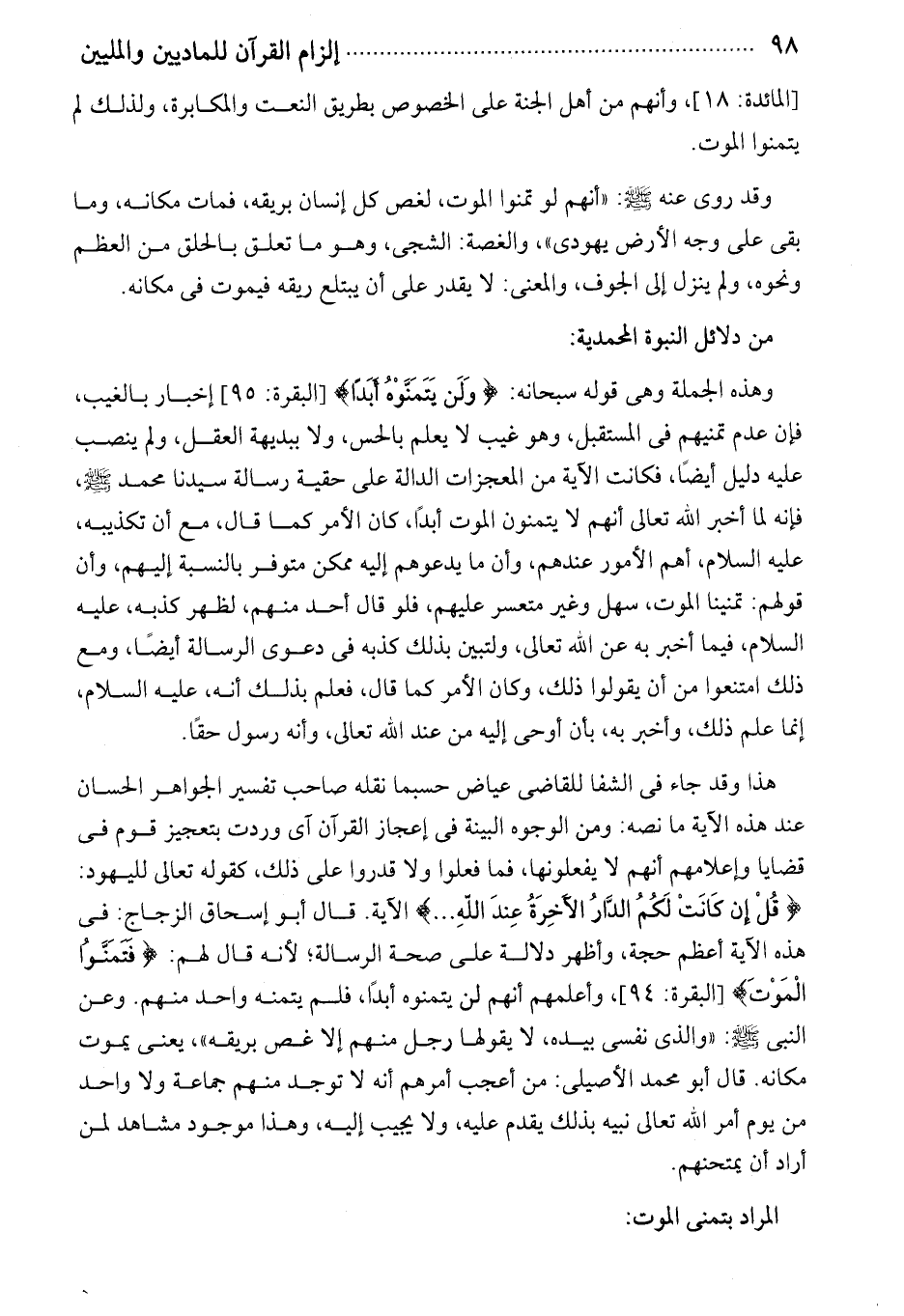 هذا وقد جاء فى الشفا للقاضى عياض حسبما نقله صاحب تفسير الجواهر الحسان عند هذه الآية ما نصه: ومن الوجوه البينة فى إعجاز القرآن آى وردت بتعجيز قوم فى قضايا وإعلامهم أنهم لا يفعلونها، فما فعلوا ولا قدروا على ذلك، كقوله تعالى لليهود: