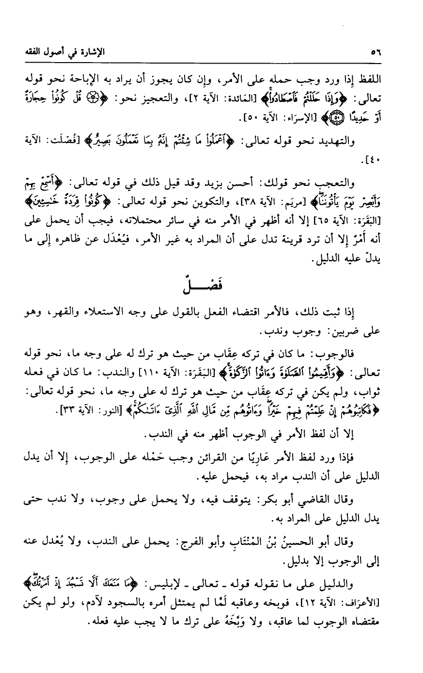 اللفظ إِذا ورد وجب حمله على الأمر، وإِن كان يجوز أن يراد به الإِباحة نحو قوله تعالى: {وَإِذَا حَلَلْتُمْ فَاصْطَادُوا} [المَائدة: الآية ٢]، والتعجيز نحو: {قُلْ كُونُوا حِجَارَةً أَوْ حَدِيدًا (٥٠)} [الإسراء: الآية ٥٠].