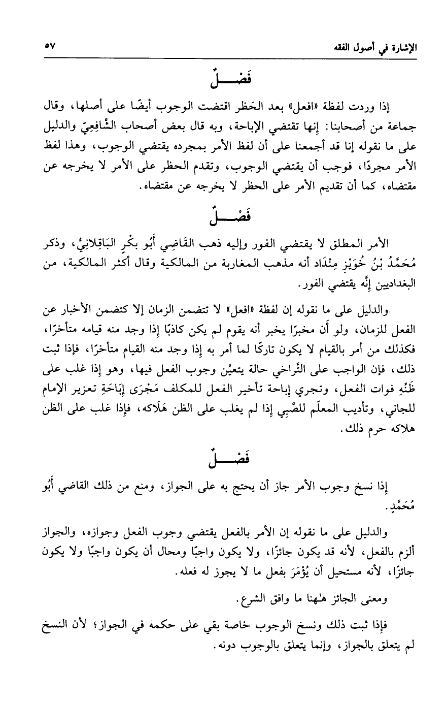 والدليل على ما نقوله إن الأمر بالفعل يقتضي وجوب الفعل وجوازه، والجواز ألزم بالفعل؛ لأنه قد يكون جائزًا، ولا يكون واجبًا ومحال أن يكون واجبًا ولا يكون جائزًا، لأنه مستحيل أن يُؤْمَرَ بفعل ما لا يجوز له فعله.