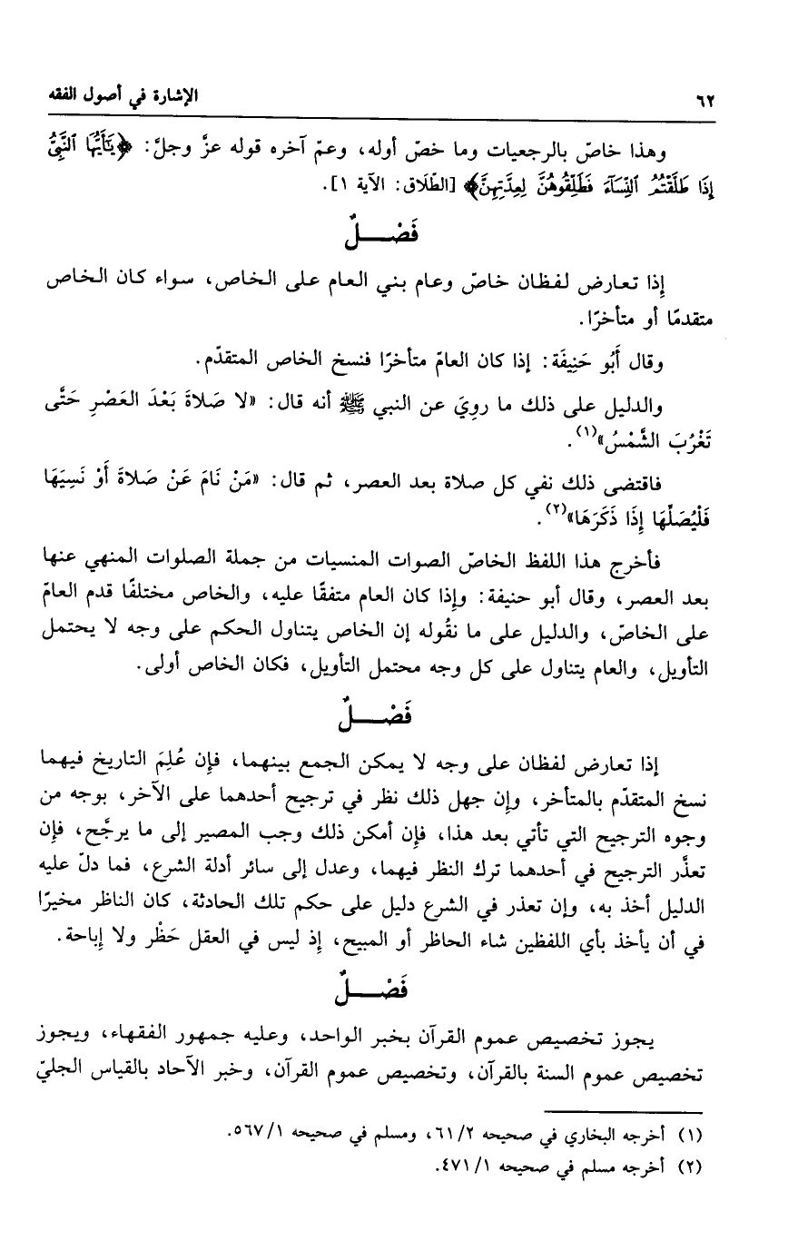 فأخرج هذا اللفظ الخاصّ الصوات المنسيات من جملة الصلوات المنهي عنها بعد العصر، وقال أبو حنيفة: وإذا كان العام متفقًا عليه، والخاص مختلفًا قدم العامّ على الخاصّ، والدليل على ما نقُوله إن الخاص يتناول الحكم على وجه لا يحتمل التأويل، والعام يتناول على كل وجه محتمل التأويل، فكان الخاص أولى.