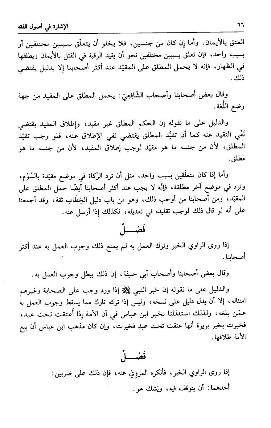 وأما إذا كان متعلِّقين بسبب واحد، مثل أن ترد الزَّكاة في موضع مقيّدة بالسَّوْم، وترد في موضع آخر مطلقة، فإِنَّه لا يجب عند أكثر أصحابنا أَيضًا حمل المطلق على المقيد، ومن أصحابنا من أوجب ذلك، وهو من باب دليل الخِطَاب ثِقَة، وقد أجمعنا على أنه لو قال ذلك لوجب تقليده في تعديله، فكذلك إِذا أرسل عنه.