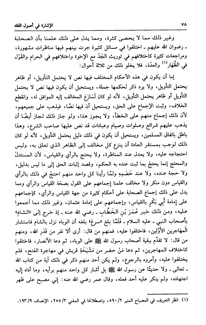 إما أن يكون في هذه الأحكام المختلف فيها نص لا يحتمل التأويل، أو ظاهر يحتمل التأويل، ولا يرد ذكر لحكمها جملة، وششحيل أن يكون فيها نص لا يحتمل التأويل أو ظاهر يحتمل التأويل، لأنه لو كان لسَارَعَ المخالف إليه الموافق له، وانقطع الخلاف، وثبت الإجماع على الحق، ويستحيل أن فيها نصًّا، فيذهب على جميعهم، لأن ذلك إجماع منهم على الخطأ، ولا يجوز هذا، ولو جاز ذلك لجاز أَيضًا أن يذهب عليهم شرائع وصلوات وصيام وعبادات قد نص عليها صاحب الشرع، وهذا باطل باتفاق المسلمين، ويستحيل أن يكون في ذلك دليل يحتمل التأويل، لأنه لو كان ذلك لوجب بمستقر العادة أن ينزع كل مخالف إلى الظاهر الذي تعلق به، وليس احتجاجه عليه، ولا يعدل عند المناظرة، ولا يحتج بالرأي والقياس، لأن المستدلّ والمحتج إنما يحتجّ بما ثبت عنده به الحكم، وقصد إثبات الحق إِلى ما ليس بدليل، ولا حجة عنده، ولا عند خَصْمِهِ ولمَّا رأينا كل واحد منهم احتجّ في ذلك بالرأي والقياس دون منكر ولا مخالف علمنا إِجماعهم على القول بصحّة القياس والرأي ومما يدل على ذلك إجماع الصحابة على أحكام كثيرة من جهة القياس والرأي، كإجماعهم على إِمامة أَبِي بَكْرٍ بالقياس، وإجماعهم على إمامة عثمان، وغير ذلك مما أجمعوا عليه، ومن ذلك خبر عُمَرَ بْنِ الخَطابِ -رضي اللَّه عنه- إذ خرج إلى "الشام" بأصحاب النبي -عليه السلام- فَلَمَّا بلغ "سرغ" بلغه أن الوباء نزل بالشام فاستشار الْمهَاجرين الأَوَّلين، فاختلفوا عليه، فمنهم من قال: أرى ألا نفر من قَدَرِ اللَّه، ومنهم من قال: لا تقدَّم ببقية أصحاب رسول اللَّه -صلى اللَّه عليه وسلم- على الوباء، ثم دعا الأنصار، فاختلفوا كاختلاف المهاجرين، ثم دعا مَنْ حضر من مَشْيَخَةِ قريش في مهاجرة الفتح، فلم يختلفوا عليه، وأمروه بالرجوع، ولم يكن أحد منهم ذكر في ذلك آية من كتاب اللَّه -تعالى- ولا حديثًا عن رسول اللَّه -صلى اللَّه عليه وسلم- بل أشار كل واحد منهم برأيه، وما أداه إِليه اجتهاده، ولم ينكر عليه أحد فعله، وقال عمر رضي اللَّه عنه: إِني مصبح على ظهر