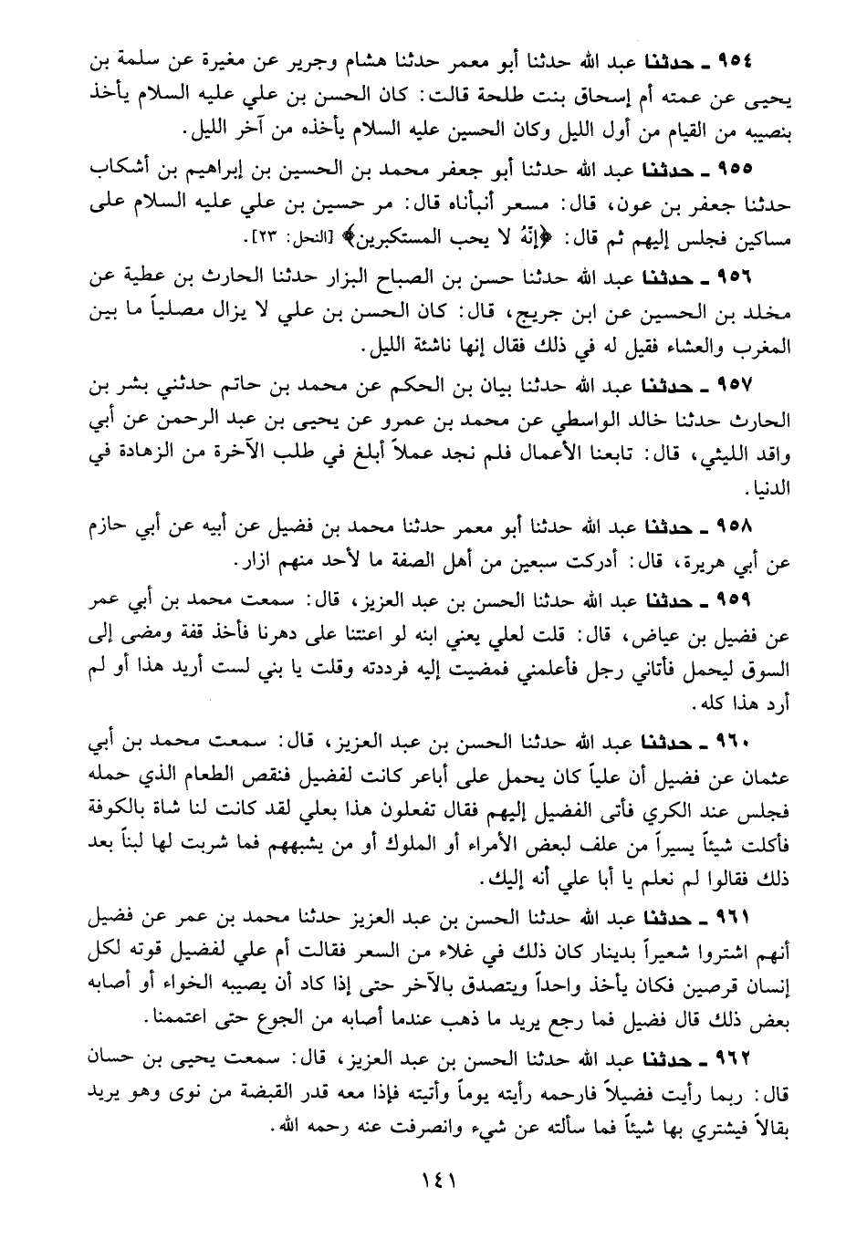 962 - حَدَّثَنَا عَبْدُ اللَّهِ، حَدَّثَنَا الْحَسَنُ بْنُ عَبْدِ الْعَزِيزِ، قَالَ سَمِعْتُ يَحْيَى بْنَ حَسَّانَ قَالَ: §رُبَّمَا رَأَيْتُ فُضَيْلًا فَأَرْحَمُهُ؛ رَأَيْتُهُ يَوْمًا وَأَتَيْتُهُ فَإِذَا مَعَهُ قَدْرُ الْقَبْضَةِ مِنْ نَوَى، وَهُوَ يُرِيدُ بَقَّالًا فِيَشْتَرِي بِهَا شَيْئًا، فَمَا سَأَلْتُهُ عَنْ شَيْءٍ، وَانْصَرَفْتُ عَنْهُ رَحِمَهُ اللَّهُ "