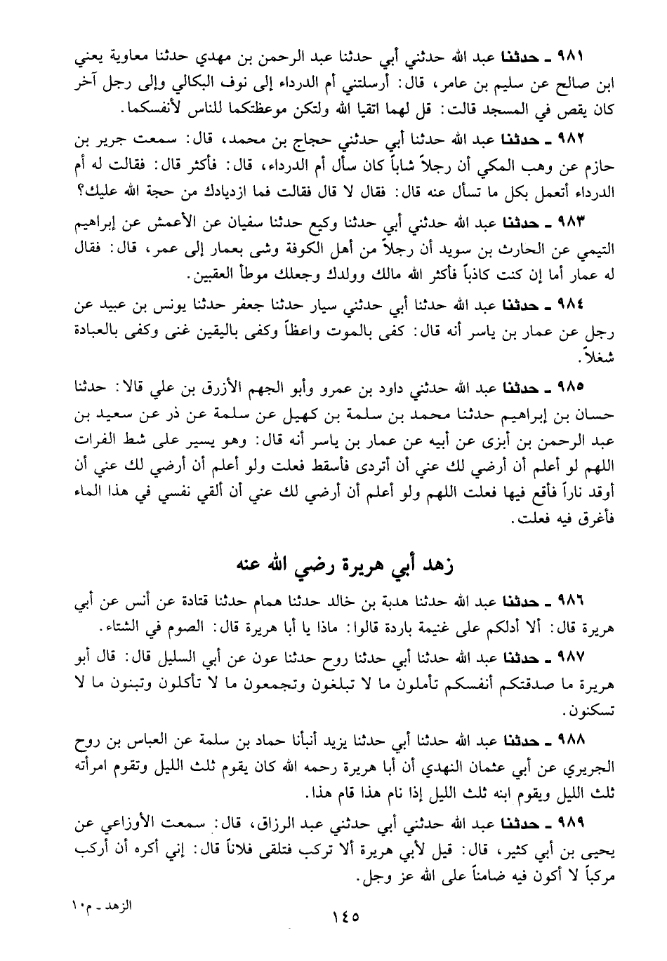 988 - حَدَّثَنَا عَبْدُ اللَّهِ، حَدَّثَنَا أَبِي، حَدَّثَنَا يَزِيدُ، أَنْبَأَنَا حَمَّادُ بْنُ سَلَمَةَ، عَنِ الْعَبَّاسِ بْنِ رَوْحٍ الْجَرِيرِيِّ، عَنْ أَبِي عُثْمَانَ النَّهْدِيِّ، أَنَّ أَبَا هُرَيْرَةَ، رَحِمَهُ اللَّهُ §كَانَ يَقُومُ ثُلُثَ اللَّيْلِ، وَتَقُومُ امْرَأَتُهُ ثُلُثَ اللَّيْلِ، وَيَقُومُ ابْنُهُ ثُلُثَ اللَّيْلِ، إِذَا نَامَ هَذَا قَامَ هَذَا "