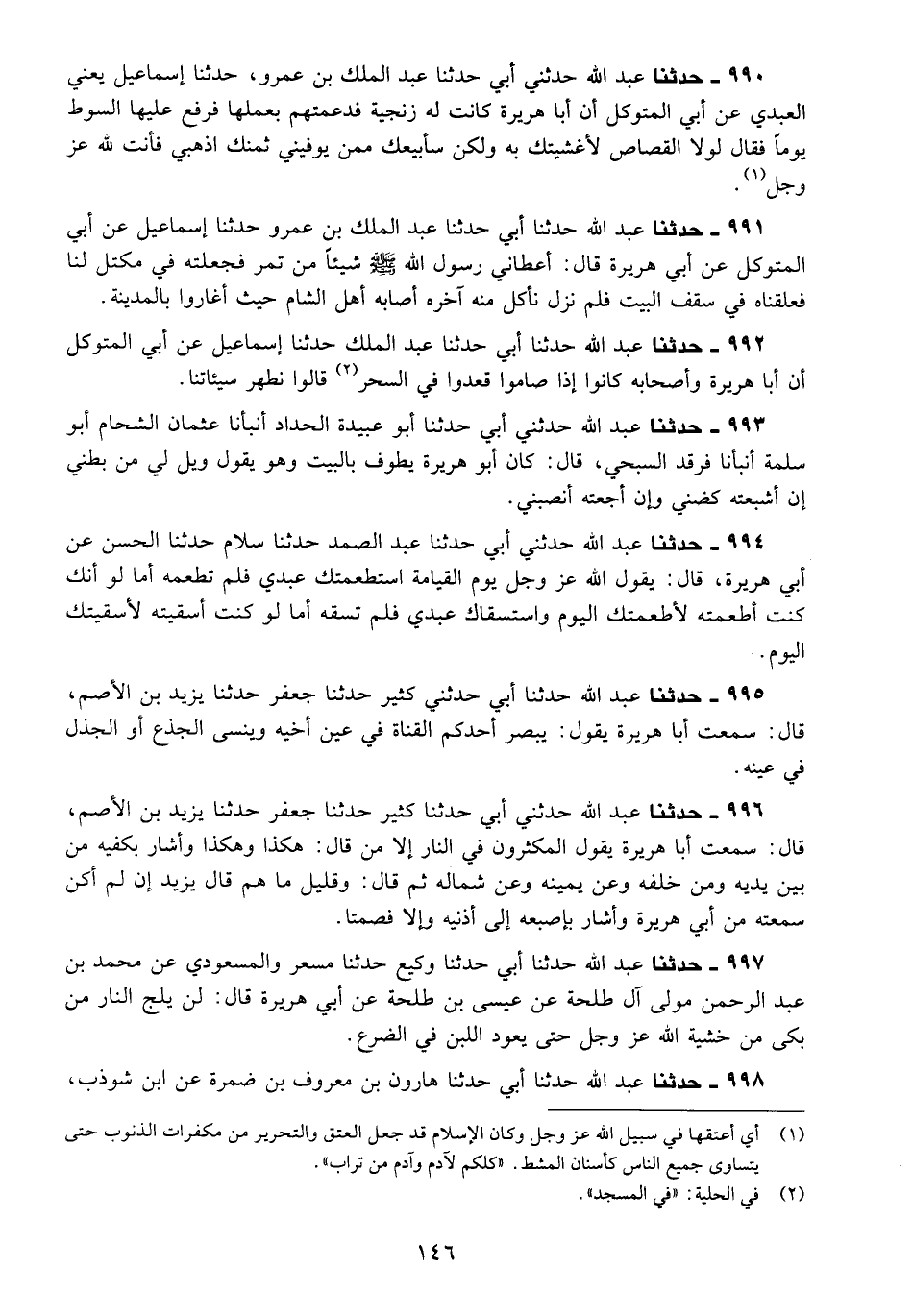 990 - حَدَّثَنَا عَبْدُ اللَّهِ، حَدَّثَنِي أَبِي، حَدَّثَنَا عَبْدُ الْمَلِكِ بْنُ عَمْرٍو، حَدَّثَنَا إِسْمَاعِيلُ يَعْنِي الْعَبْدِيَّ عَنْ أَبِي الْمُتَوَكِّلِ، أَنَّ أَبَا هُرَيْرَةَ كَانَتْ لَهُ زِنْجِيَّةٌ، فَدَعَّمَتْهُمْ بِعَمَلِهَا، فَرَفَعَ عَلَيْهَا السَّوْطَ يَوْمًا، فَقَالَ: §لَوْلَا الْقِصَاصُ لَأَغْشَيْتُكِ بِهِ، وَلَكِنْ سَأَبِيعُكِ مِمَّنْ يُوَفِّينِي ثَمَنَكِ، اذْهَبِي فَأَنْتِ لِلَّهِ عَزَّ وَجَلَّ "