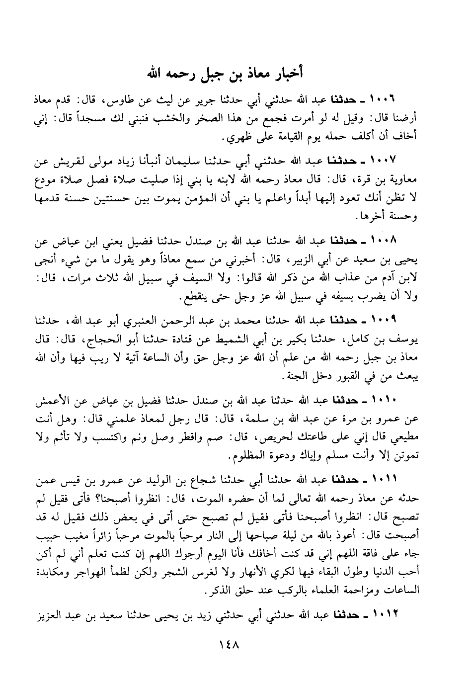 1011 - حَدَّثَنَا عَبْدُ اللَّهِ، حَدَّثَنَا أَبِي، حَدَّثَنَا شُجَاعُ بْنُ الْوَلِيدِ، عَنْ عَمْرِو بْنِ قَيْسٍ، عَمَّنْ حَدَّثَهُ عَنْ مُعَاذٍ رَحِمَهُ اللَّهُ تَعَالَى لَمَّا أَنْ حَضَرَهُ الْمَوْتُ قَالَ: §انْظُرُوا أَصْبَحْنَا؟ فَأُتِيَ فَقِيلَ: لَمْ تُصْبِحْ، قَالَ: انْظُرُوا أَصْبَحْنَا، فَأُتِيَ فَقِيلَ: لَمْ تُصْبِحْ حَتَّى أُتِيَ فِي بَعْضِ ذَلِكَ، فَقِيلَ لَهُ: قَدْ أَصْبَحْتَ، قَالَ: أَعُوذُ بِاللَّهِ مِنْ لَيْلَةٍ صَبَاحُهَا إِلَى النَّارِ، مَرْحَبًا بِالْمَوْتِ، مَرْحَبًا زَائِرًا مُغَيَّبًا حَبِيبًا، جَاءَ عَلَى فَاقَةٍ، اللَّهُمَّ إِنِّي قَدْ كُنْتُ أَخَافُكَ، فَأَنَا الْيَوْمَ أَرْجُوكَ، اللَّهُمَّ إِنْ كُنْتَ تَعْلَمُ أَنِّي لَمْ أَكُنْ أُحِبُّ الدُّنْيَا وَطُولَ الْبَقَاءِ فِيهَا لِكَرْيِ الْأَنْهَارِ وَلَا لِغَرْسِ الشَّجَرِ، وَلَكِنْ لِظَمَأِ الْهَوَاجِرِ وَمُكَابَدَةِ السَّاعَاتِ وَمُزَاحَمَةِ الْعُلَمَاءِ بِالرُّكَبِ عِنْدَ حِلَقِ الذِّكْرِ "