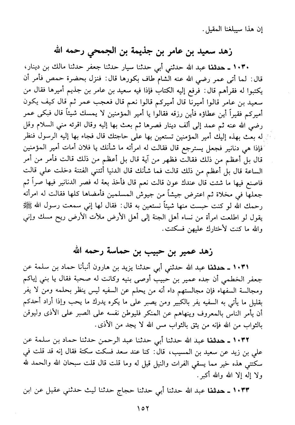 1030 - حَدَّثَنَا عَبْدُ اللَّهِ، حَدَّثَنِي أَبِي، حَدَّثَنَا سَيَّارٌ، حَدَّثَنَا جَعْفَرٌ، حَدَّثَنَا مَالِكُ بْنُ دِينَارٍ قَالَ: لَمَّا أَتَى عُمَرُ رَضِيَ اللَّهُ عَنْهُ الشَّامَ طَافَ بِكُوَرِهَا قَالَ: فَنَزَلَ بِحَضْرَةِ حِمْصَ، فَأَمَرَ أَنْ يَكْتُبُوا لَهُ فُقَرَاءَهُمْ قَالَ: فَرُفِعَ إِلَيْهِ الْكِتَابُ، فَإِذَا فِيهِ سَعِيدُ بْنُ عَامِرِ بْنِ جُذَيْمٍ أَمِيرُهَا، فَقَالَ: مَنْ سَعِيدُ بْنُ عَامِرٍ؟ قَالُوا: أَمِيرُنَا، قَالَ: أَمِيرُكُمْ، قَالُوا: نَعَمْ، قَالَ: فَعَجِبَ عُمَرُ، ثُمَّ قَالَ: §كَيْفَ يَكُونُ أَمِيرُكُمْ فَقِيرًا؟ أَيْنَ عَطَاؤُهُ؟ فَأَيْنَ رِزْقُهُ؟ فَقَالُوا: يَا أَمِيرَ الْمُؤْمِنِينَ لَا يُمْسِكُ شَيْئًا، قَالَ: فَبَكَى عُمَرُ رَضِيَ اللَّهُ عَنْهُ، ثُمَّ عَمَدَ إِلَى أَلْفِ دِينَارٍ، فَصَرَّهَا، ثُمَّ بَعَثَ بِهَا إِلَيْهِ، وَقَالَ: أَقْرِئْهُ مِنِّي السَّلَامَ، وَقُلْ لَهُ: بَعَثَ بِهَذِهِ إِلَيْكَ أَمِيرُ الْمُؤْمِنِينَ تَسْتَعِينُ بِهَا عَلَى حَاجَتِكَ قَالَ: فَجَاءَ بِهَا إِلَيْهِ الرَّسُولُ، فَنَظَرَ فَإِذَا هِيَ دَنَانِيرُ، فَجَعَلَ يَسْتَرْجِعُ، قَالَ: فَقَالَتْ لَهُ امْرَأَتُهُ: مَا شَأْنُكَ يَا فُلَانُ؟ أَمَاتَ أَمِيرُ الْمُؤْمِنِينَ؟ قَالَ: بَلْ أَعْظَمُ مِنْ ذَلِكَ، فَقَالَتْ: فَظَهَرَ مِنْ آيَةٍ؟ قَالَ: بَلْ أَعْظَمُ مِنْ ذَلِكَ، قَالَتْ: فَأَمْرٌ مِنْ أَمْرِ السَّاعَةِ؟ قَالَ: بَلْ أَعْظَمُ مِنْ ذَلِكَ، قَالَتْ: فَمَا شَأْنُكَ؟ قَالَ: الدُّنْيَا أَتَتْنِي، الْفِتْنَةُ دَخَلَتْ عَلَيَّ، قَالَتْ: فَاصْنَعْ فِيهَا مَا شِئْتَ قَالَ: عِنْدَكِ عَوْنٌ، قَالَتْ: نَعَمْ، قَالَ: فَأَخَذَ بِعَةً لَهُ فَصَرَّ الدَّنَانِيرَ فِيهَا صَرًّا، ثُمَّ جَعَلَهَا فِي مِخْلَاةٍ، ثُمَّ اعْتَرَضَ جَيْشًا مِنْ جُيُوشِ الْمُسْلِمِينَ، فَأَمْضَاهَا كُلَّهَا، فَقَالَتْ لَهُ امْرَأَتُهُ: رَحِمَكَ اللَّهُ لَوْ كُنْتَ حَبَسْتَ مِنْهَا شَيْئًا نَسْتَعِينُ بِهِ؟ قَالَ: فَقَالَ لَهَا: إِنِّي سَمِعْتُ رَسُولَ اللَّهِ صَلَّى اللَّهُ عَلَيْهِ وَسَلَّمَ يَقُولُ: «لَوِ اطَّلَعَتِ امْرَأَةٌ مِنْ نِسَاءِ أَهْلِ الْجَنَّةِ إِلَى أَهْلِ الْأَرْضِ مَلَأَتِ الْأَرْضَ رِيحَ مِسْكٍ» وَإِنِّي وَاللَّهِ مَا كُنْتُ لِأَخْتَارَكِ عَلَيْهِنَّ، فَسَكَتَتْ "