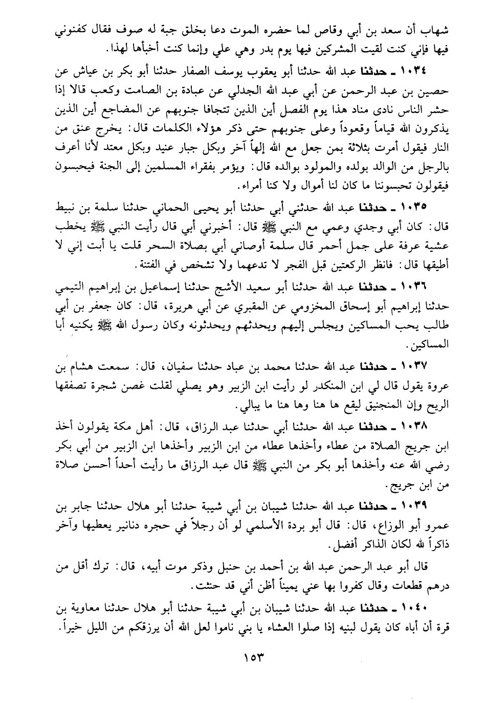 1034 - حَدَّثَنَا عَبْدُ اللَّهِ، حَدَّثَنَا أَبُو يَعْقُوبَ يُوسُفُ الصَّفَّارُ، حَدَّثَنَا أَبُو بَكْرِ بْنُ عَيَّاشٍ، عَنْ حُصَيْنِ بْنِ عَبْدِ الرَّحْمَنِ، عَنْ أَبِي عَبْدِ اللَّهِ الْجَدَلِيِّ، عَنْ عُبَادَةَ بْنِ الصَّامِتِ، وَكَعْبٍ، قَالَا: إِذَا حُشِرَ النَّاسُ نَادَى مُنَادٍ: هَذَا يَوْمُ الْفَصْلِ، أَيْنَ الَّذِينَ تَتَجَافَى جُنُوبُهُمْ عَنِ الْمَضَاجِعِ؟ أَيْنَ الَّذِينَ يَذْكُرُونَ اللَّهَ قِيَامًا وَقُعُودًا وَعَلَى جُنُوبِهِمْ؟ حَتَّى ذَكَرَ هَؤُلَاءِ الْكَلِمَاتِ، قَالَ: يَخْرُجُ عُنُقٌ مِنَ النَّارِ، فَيَقُولُ: أُمِرْتُ بِثَلَاثَةٍ: بِمَنْ جَعَلَ مَعَ اللَّهِ إِلَهًا آخَرَ، وَبِكُلِّ جَبَّارٍعَنِيدٍ، وَبِكُلِّ مُعْتَدٍ، لَأَنَا أَعْرَفُ بِالرَّجُلِ مِنَ الْوَالِدِ بِوَلَدِهِ وَالْمَوْلُودِ بِوَالِدِهِ قَالَ: §وَيُؤْمَرُ بِفُقَرَاءِ الْمُسْلِمِينَ إِلَى الْجَنَّةِ، فَيُحْبَسُونَ، فَيَقُولُونَ: تَحْبِسُونَنَا مَا كَانَ لَنَا أَمْوَالٌ وَلَا كُنَّا أُمَرَاءَ "