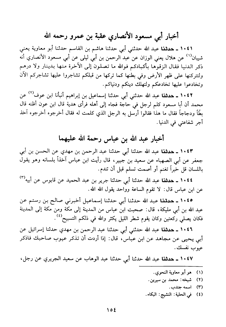 1041 - حَدَّثَنَا عَبْدُ اللَّهِ، حَدَّثَنِي أَبِي، حَدَّثَنَا هَاشِمُ بْنُ الْقَاسِمِ، حَدَّثَنَا أَبُو مُعَاوِيَةَ، يَعْنِي شَيْبَانَ عَنْ هِلَالٍ، يَعْنِي الْوَزَّانَ عَنْ عَبْدِ الرَّحْمَنِ بْنِ أَبِي لَيْلَى، عَنْ أَبِي مَسْعُودٍ الْأَنْصَارِيِّ أَنَّهُ ذَكَرَ الدُّنْيَا فَقَالَ: §أَلْزِقُوهَا بِأَكْبَادِكُمْ فَوَاللَّهِ مَا تَصِلُونَ إِلَى الْآخِرَةِ مِنْهَا بِدِينَارٍ وَلَا دِرْهَمٍ وَلَتَتْرُكُنَّهَا عَلَى ظَهْرِ الْأَرْضِ وَفِي بَطْنِهَا كَمَا تَرَكَهَا مَنْ قَبْلَكُمْ، تَشَاجَرُوا عَلَيْهَا تَشَاجُرَكُمُ الْآنَ وَتَخَادَعُوا عَلَيْهَا تَخَادُعَكُمْ، وَلَتَهْلِكُ دِينَكُمْ وَدُنْيَاكُمْ "