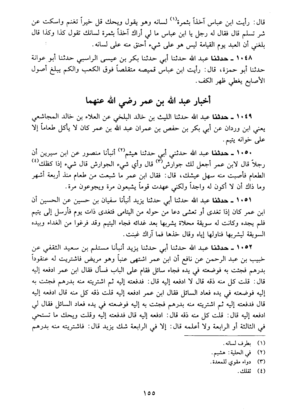 1052 - حَدَّثَنَا عَبْدُ اللَّهِ، حَدَّثَنَا أَبِي، حَدَّثَنَا يَزِيدُ، أَنْبَأَنَا مُسْتَلِمُ بْنُ سَعِيدٍ الثَّقَفِيُّ، عَنْ خُبَيْبِ بْنِ عَبْدِ الرَّحْمَنِ، عَنْ نَافِعٍ، أَنَّ ابْنَ عُمَرَ، §اشْتَهَى عِنَبًا وَهُوَ مَرِيضٌ فَاشْتَرَيْتُ لَهُ عُنْقُودًا بِدِرْهَمٍ فَجِئْتُ بِهِ فَوَضَعْتُهُ فِي يَدِهِ، فَجَاءَ سَائِلٌ فَقَامَ عَلَى الْبَابِ فَسَأَلَ، فَقَالَ ابْنُ عُمَرَ: ادْفَعْهُ إِلَيْهِ قَالَ: قُلْتُ: كُلْ مِنْهُ ذُقْهُ قَالَ: لَا، ادْفَعْهُ إِلَيْهِ قَالَ: فَدَفَعْتُهُ إِلَيْهِ، ثُمَّ اشْتَرَيْتُهُ مِنْهُ بِدِرْهَمٍ، فَجِئْتُ بِهِ إِلَيْهِ فَوَضَعْتُهُ فِي يَدِهِ، فَعَادَ السَّائِلُ فَقَالَ ابْنُ عُمَرَ: ادْفَعْهُ إِلَيْهِ، قُلْتُ ذُقْهُ كُلْ مِنْهُ قَالَ: ادْفَعْهُ إِلَيْهِ قَالَ: فَدَفَعْتُهُ إِلَيْهِ ثُمَّ، اشْتَرَيْتُهُ مِنْهُ بِدِرْهَمٍ فَجِئْتُ بِهِ إِلَيْهِ فَوَضَعْتُهُ فِي يَدِهِ فَعَادَ السَّائِلُ، فَقَالَ لِي: ادْفَعْهُ إِلَيْهِ قَالَ: قُلْتُ: كُلْ مِنْهُ ذُقْهُ قَالَ: ادْفَعْهُ إِلَيْهِ قَالَ: فَدَفَعْتُهُ إِلَيْهِ وَقُلْتُ: وَيْحَكَ مَا تَسْتَحِي فِي الثَّالِثَةِ أَوِ الرَّابِعَةِ وَلَا أَعْلَمُهُ قَالَ إِلَّا فِي الرَّابِعَةِ، شَكَّ يَزِيدُ قَالَ: فَاشْتَرَيْتُهُ مِنْهُ بِدِرْهَمٍ -[156]- فَذَهَبْتُ فَجِئْتُ بِهِ إِلَيْهِ فَأَكَلَهُ "