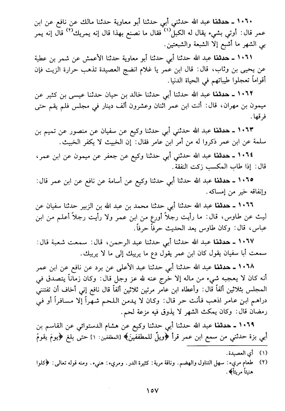 1061 - حَدَّثَنَا عَبْدُ اللَّهِ، حَدَّثَنَا أَبِي، حَدَّثَنَا أَبُو مُعَاوِيَةَ، حَدَّثَنَا الْأَعْمَشُ، عَنْ شِمْرِ بْنِ عَطِيَّةَ، عَنْ يَحْيَى بْنِ وَثَّابٍ قَالَ: قَالَ ابْنُ عُمَرَ: §يَا غُلَامُ، أَنْضِجِ الْعَصِيدَةَ تَذْهَبْ حَرَارَةُ الزَّيْتِ، فَإِنَّ أَقْوَامًا تَعَجَّلُوا طَيِّبَاتِهِمْ فِي الْحَيَاةِ الدُّنْيَا "