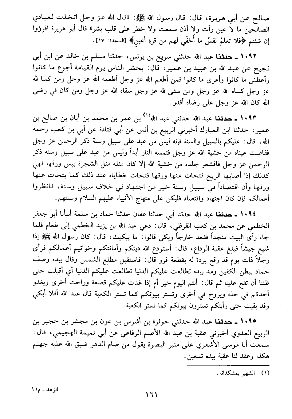 1093 - حَدَّثَنَا عَبْدُ اللَّهِ، حَدَّثَنِي عَبْدُ اللَّهِ بْنُ عُمَرَ بْنِ مُحَمَّدِ بْنِ أَبَانَ بْنِ صَالِحِ بْنِ عُمَيْرٍ، حَدَّثَنَا ابْنُ الْمُبَارَكِ، أَخْبَرَنِي الرَّبِيعُ بْنُ أَنَسٍ، عَنْ أَبِي قَتَادَةَ، عَنْ أُبَيِّ بْنِ كَعْبٍ، رَحِمَهُ اللَّهُ قَالَ: §عَلَيْكُمْ بِالسَّبِيلِ وَالسُّنَّةِ فَإِنَّهُ لَيْسَ مِنْ عَبْدٍ عَلَى سَبِيلٍ وَسُنَّةٍ، ذَكَرَ الرَّحْمَنَ عَزَّ وَجَلَّ فَفَاضَتْ عَيْنَاهُ مِنْ خَشْيَةِ اللَّهِ عَزَّ وَجَلَّ فَتَمَسَّهُ النَّارُ أَبَدًا، وَلَيْسَ مِنْ عَبْدٍ عَلَى سَبِيلٍ وَسُنَّةٍ ذَكَرَ الرَّحْمَنَ عَزَّ وَجَلَّ فَاقْشَعَرَّ جِلْدُهُ مِنْ خَشْيَةِ اللَّهِ إِلَّا كَانَ مَثَلُهُ مَثَلَ الشَّجَرَةِ يَبِسَ وَرَقُهَا فَهِيَ كَذَلِكَ، إِذَا أَصَابَهَا الرِّيحُ فَتَحَاتَّ عَنْهَا وَرَقُهَا فَتَحَاتَّ خَطَايَاهُ عِنْدَ ذَلِكَ كَمَا يَتَحَاتُّ عَنْهَا وَرَقُهَا، وَإِنَّ اقْتِصَادًا فِي سَبِيلٍ وَسُنَّةٍ خَيْرٌ مِنِ اجْتِهَادٍ فِي خِلَافِ سَبِيلٍ وَسُنَّةٍ، فَانْظُرُوا أَعْمَالَكُمْ فَإِنْ كَانَ اجْتِهَادٌ وَاقْتِصَادٌ فَلْيَكُنْ عَلَى مِنْهَاجِ الْأَنْبِيَاءِ عَلَيْهِمُ السَّلَامُ وَسُنَّتِهِمْ، "