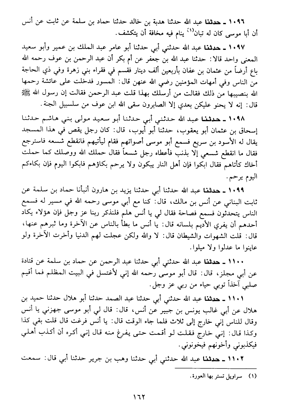 1096 - حَدَّثَنَا عَبْدُ اللَّهِ، حَدَّثَنَا هُدْبَةُ بْنُ خَالِدٍ، حَدَّثَنَا حَمَّادُ بْنُ سَلَمَةَ، عَنْ ثَابِتٍ، عَنْ أَنَسٍ §أَنَّ أَبَا مُوسَى، كَانَ لَهُ تُبَّانٌ يَنَامُ فِيهِ مَخَافَةَ أَنْ يَتَكَشَّفَ "