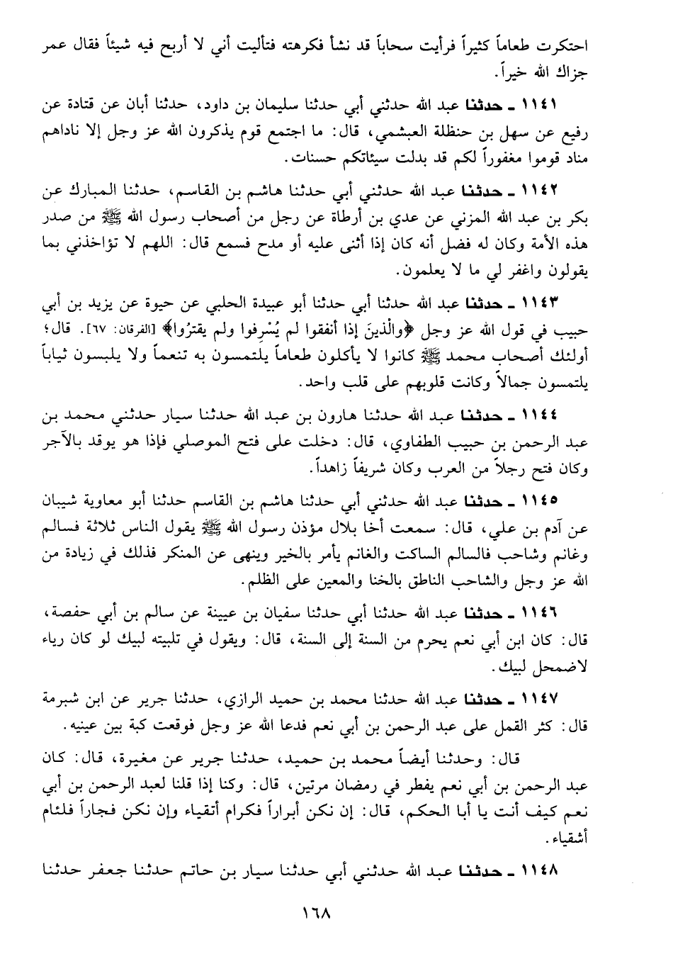 1143 - حَدَّثَنَا عَبْدُ اللَّهِ، حَدَّثَنَا أَبِي، حَدَّثَنَا أَبُو عُبَيْدَةَ الْحَلَبِيُّ، عَنْ حَيْوَةَ، عَنْ يَزِيدَ بْنِ أَبِي حَبِيبٍ، فِي قَوْلِ اللَّهِ عَزَّ وَجَلَّ: {§وَالَّذِينَ إِذَا أَنْفَقُوا لَمْ يُسْرِفُوا وَلَمْ يَقْتُرُوا} [الفرقان: 67] قَالَ: أُولَئِكَ أَصْحَابُ مُحَمَّدٍ صَلَّى اللَّهُ عَلَيْهِ وَسَلَّمَ كَانُوا لَا يَأْكُلُونَ طَعَامًا يَلْتَمِسُونَ بِهِ تَنَعُّمًا وَلَا يَلْبَسُونَ ثِيَابًا يَلْتَمِسُونَ جَمَالًا، وَكَانَتْ قُلُوبُهُمْ عَلَى قَلْبٍ وَاحِدٍ.