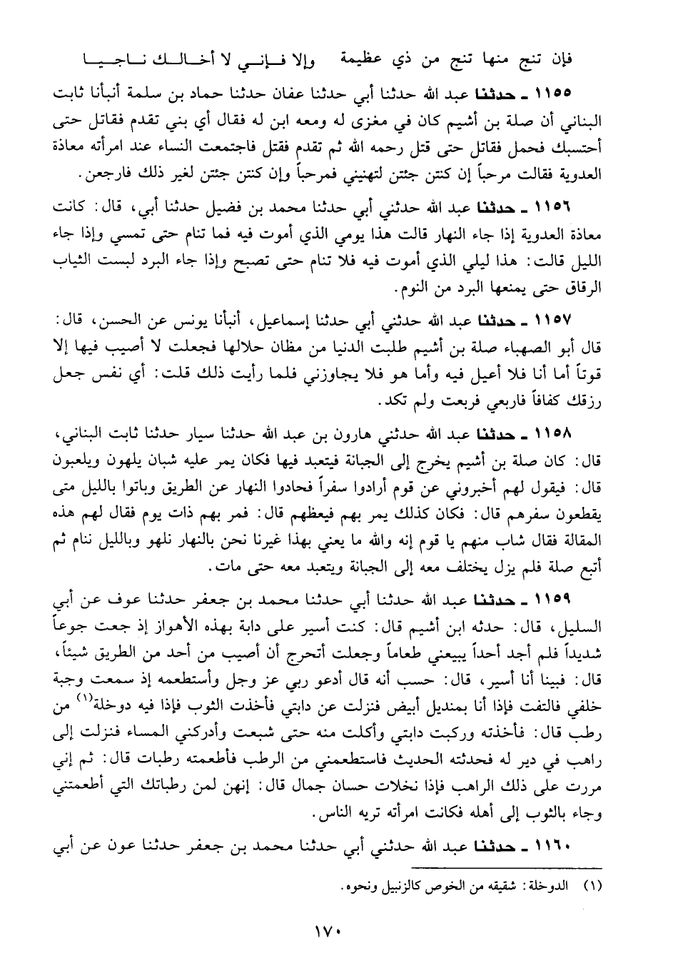 1159 - حَدَّثَنَا عَبْدُ اللَّهِ، حَدَّثَنَا أَبِي، حَدَّثَنَا مُحَمَّدُ بْنُ جَعْفَرٍ، حَدَّثَنَا عَوْفٌ، عَنْ أَبِي السَّلِيلِ قَالَ: حَدَّثَهُ ابْنُ أَشْيَمَ قَالَ: §كُنْتُ أَسِيرُ عَلَى دَابَّةٍ بِهَذِهِ الْأَهْوَازِ إِذْ جُعْتُ جُوعًا شَدِيدًا فَلَمْ أَجِدْ أَحَدًا يَبِيعُنِي طَعَامًا وَجَعَلْتُ أَتَحَرَّجُ أَنْ أُصِيبَ مِنْ أَحَدٍ مِنَ الطَّرِيقِ شَيْئًا قَالَ: فَبَيْنَا أَنَا أَسِيرُ قَالَ: حَسِبَ أَنَّهُ قَالَ: أَدْعُو رَبِّي عَزَّ وَجَلَّ وَأَسْتَطْعِمُهُ إِذْ سَمِعْتُ وَجْبَةً خَلْفِي، فَالْتَفَتُّ فَإِذَا أَنَا بِمِنْدِيلٍ أَبْيَضَ فَنَزَلْتُ عَنْ دَابَّتِي فَأَخَذْتُ الثَّوْبَ فَإِذَا فِيهِ دَوْخَلَةٌ مِنْ رُطَبٍ قَالَ: فَأَخَذْتُهُ وَرَكِبْتُ دَابَّتِي وَأَكَلْتُ مِنْهُ حَتَّى شَبِعْتُ، وَأَدْرَكَنِي الْمَسَاءُ فَنَزَلْتُ إِلَى رَاهِبٍ فِي دَيْرٍ لَهُ فَحَدَّثْتُهُ الْحَدِيثَ فَاسْتَطْعَمَنِي مِنَ الرُّطَبِ فَأَطْعَمْتُهُ رُطَبَاتٍ قَالَ: ثُمَّ إِنِّي مَرَرْتُ عَلَى ذَلِكَ الرَّاهِبِ فَإِذَا نَخْلَاتٌ حِسَانٌ جُمَالٌ قَالَ: إِنَّهُنَّ لَمِنْ رُطَبَاتِكَ الَّتِي أَطْعَمْتَنِي وَجَاءَ بِالثَّوْبِ إِلَى أَهْلِهِ فَكَانَتِ امْرَأَتُهُ تُرِيهِ النَّاسَ "