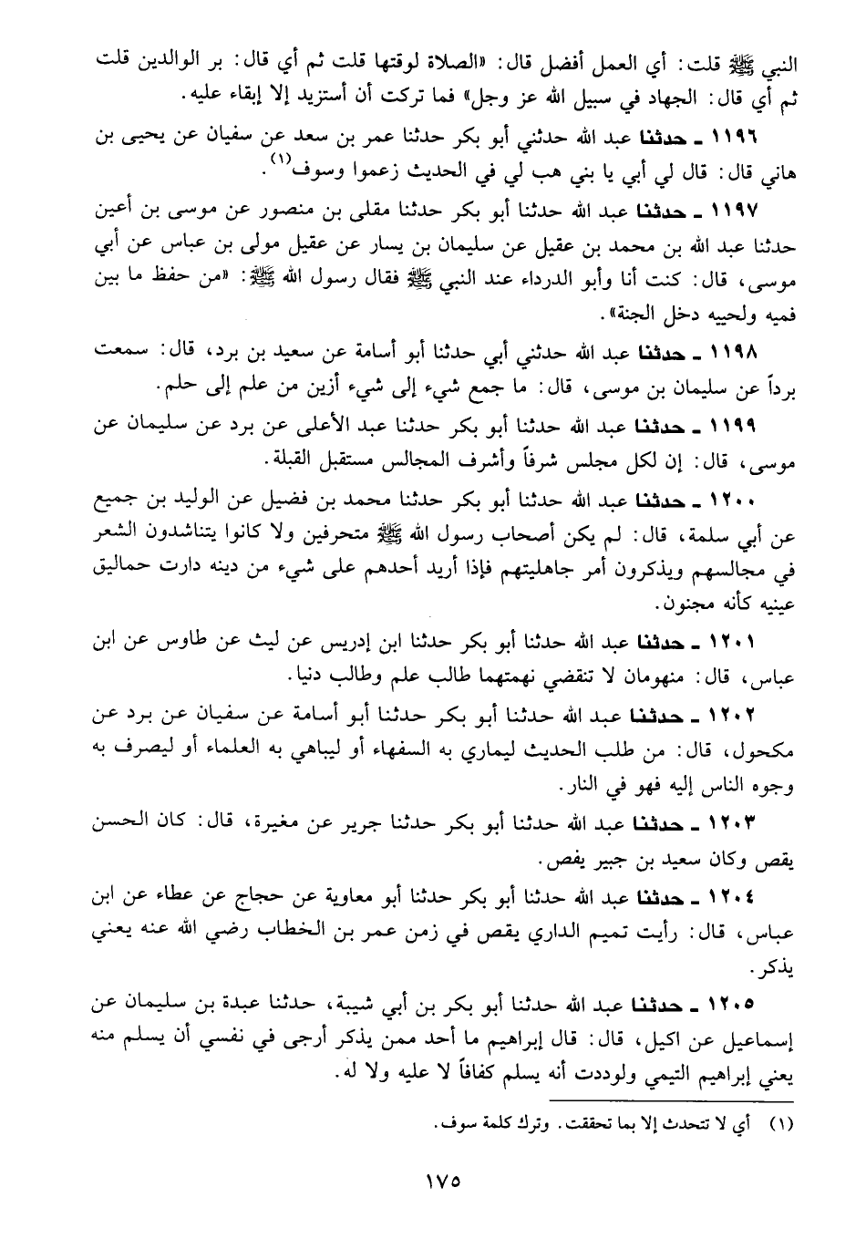 1202 - حَدَّثَنَا عَبْدُ اللَّهِ، حَدَّثَنَا أَبُو بَكْرٍ، حَدَّثَنَا أَبُو أُسَامَةَ، عَنْ سُفْيَانَ، عَنْ بُرْدٍ، عَنْ مَكْحُولٍ قَالَ: §مَنْ طَلَبَ الْحَدِيثَ لِيُمَارِيَ بِهِ السُّفَهَاءَ أَوْ لِيُبَاهِيَ بِهِ الْعُلَمَاءَ أَوْ لِيَصْرِفَ بِهِ وُجُوهَ النَّاسِ إِلَيْهِ فَهُوَ فِي النَّارِ.