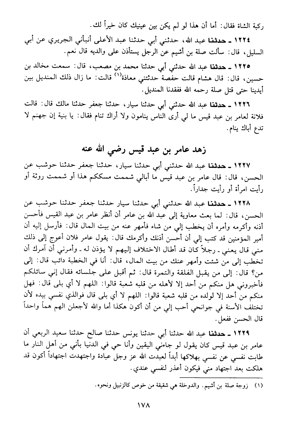 1228 - حَدَّثَنَا عَبْدُ اللَّهِ، حَدَّثَنِي أَبِي، حَدَّثَنَا سَيَّارٌ، حَدَّثَنَا جَعْفَرٌ، حَدَّثَنَا حَوْشَبٌ، عَنِ الْحَسَنِ قَالَ: لَمَّا بَعَثَ مُعَاوِيَةُ إِلَى عَبْدِ اللَّهِ بْنِ عَامِرٍ أَنِ انْظُرْ عَامِرَ بْنَ عَبْدِ الْقَيْسِ فَأَحْسِنْ إِذْنَهُ وَأَكْرِمْهُ، وَأَمَرَهُ أَنْ يَخْطُبَ إِلَى مَنْ شَاءَ فَأَمْهِرْ عَنْهُ مِنْ بَيْتِ الْمَالِ قَالَ: فَأَرْسَلَ إِلَيْهِ أَنَّ أَمِيرَ الْمُؤْمِنِينَ قَدْ كَتَبَ إِلَيَّ أَنْ أُحْسِنَ إِذْنَكَ وَأُكْرِمَكَ قَالَ: يَقُولُ عَامِرٌ: §فُلَانٌ أَحْوَجُ إِلَى ذَلِكَ مِنِّي قَالَ: يَعْنِي رَجُلًا كَانَ قَدْ أَطَالَ الِاخْتِلَافَ إِلَيْهِمْ لَا يُؤْذَنُ لَهُ وَأَمَرَنِي أَنْ آمُرَكَ أَنْ تَخْطُبَ إِلَى مَنْ شِئْتَ وَأُمْهِرَ عَنْكَ مِنْ بَيْتِ الْمَالِ قَالَ: أَنَا فِي الْخِطْبَةِ دَائِبٌ قَالَ: إِلَى مَنْ؟ قَالَ: إِلَى مَنْ يَقْبَلُ الْفُلْقَةَ وَالتَّمْرَةَ قَالَ: ثُمَّ أَقْبَلَ عَلَى جُلَسَائِهِ فَقَالَ: إِنِّي سَائِلُكُمْ فَأَخْبَرُونِي هَلْ مِنْكُمْ مِنْ أَحَدٍ إِلَّا لِأَهْلِهِ مِنْ قَلْبِهِ شُعْبَةٌ؟ قَالُوا: اللَّهُمَّ لَا، أَيْ بَلَى قَالَ: فَهَلْ مِنْكُمْ مِنْ أَحَدٍ إِلَّا لِوَلَدِهِ مِنْ قَلْبِهِ شُعْبَةٌ؟ قَالُوا: اللَّهُمَّ لَا أَيْ بَلَى قَالَ: فَوَالَّذِي نَفْسِي بِيَدِهِ لَأَنْ تَخْتَلِفَ الْأَسِنَّةُ فِي جَوَانِحِي أَحَبُّ إِلَيَّ مِنْ أَنْ أَكُونَ هَكَذَا، أَمَا وَاللَّهِ لَأَجْعَلَنَّ الْهَمَّ هَمًّا وَاحِدًا، قَالَ الْحَسَنُ: فَفَعَلَ "