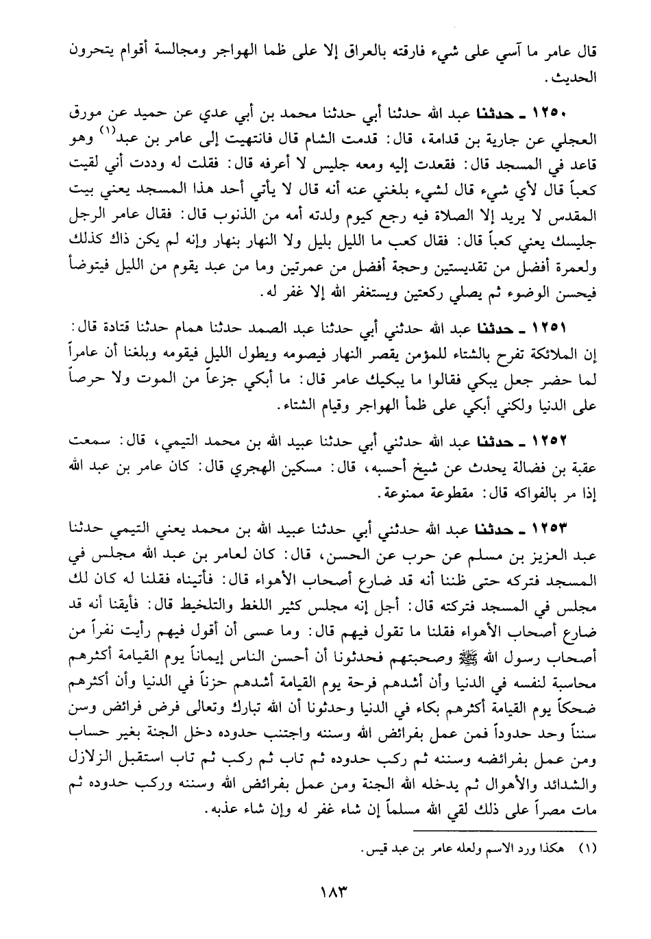 1253 - حَدَّثَنَا عَبْدُ اللَّهِ، حَدَّثَنِي أَبِي، حَدَّثَنَا عُبَيْدُ اللَّهِ بْنُ مُحَمَّدٍ، يَعْنِي التَّيْمِيَّ حَدَّثَنَا عَبْدُ الْعَزِيزِ بْنُ مُسْلِمٍ، عَنْ حَرْبٍ، عَنِ الْحَسَنِ قَالَ: كَانَ لِعَامِرِ بْنِ عَبْدِ اللَّهِ مَجْلِسٌ فِي الْمَسْجِدِ فَتَرَكَهُ حَتَّى ظَنَنَّا أَنَّهُ قَدْ ضَارَعَ أَصْحَابَ الْأَهْوَاءِ قَالَ: فَأَتَيْنَاهُ فَقُلْنَا لَهُ: كَانَ لَكَ مَجْلِسٌ فِي الْمَسْجِدِ فَتَرَكْتَهُ قَالَ: أَجَلْ إِنَّهُ مَجْلِسٌ كَثِيرُ اللَّغَطِ وَالتَّخْلِيطِ قَالَ: فَأَيْقَنَّا أَنَّهُ قَدْ ضَارَعَ أَصْحَابَ الْأَهْوَاءِ فَقُلْنَا: مَا تَقُولُ فِيهِمْ؟ قَالَ: §وَمَا عَسَى أَنْ أَقُولَ فِيهِمْ، رَأَيْتُ نَفَرًا مِنْ أَصْحَابِ رَسُولِ اللَّهِ صَلَّى اللَّهُ عَلَيْهِ وَسَلَّمَ وَصَحِبْتُهُمْ فَحَدَّثُونَا أَنَّ أَحْسَنَ النَّاسِ إِيمَانًا يَوْمَ الْقِيَامَةِ أَكْثَرُهُمْ مُحَاسَبَةً لِنَفْسِهِ فِي الدُّنْيَا وَأَنَّ أَشَدَّهُمْ فَرْحَةً يَوْمَ الْقِيَامَةِ أَشَدُّهُمْ حُزْنًا فِي الدُّنْيَا وَأَنَّ أَكْثَرَهُمْ ضَحِكًا يَوْمَ الْقِيَامَةِ أَكْثَرُهُمْ بُكَاءً فِي الدُّنْيَا، وَحَدَّثُونَا أَنَّ اللَّهَ تَبَارَكَ وَتَعَالَى فَرَضَ فَرَائِضَ وَسَنَّ سُنَنًا وَحَّدَ حُدُودًا، فَمَنْ عَمِلَ بِفَرَائِضِ اللَّهِ وَسُنَنِهِ وَاجْتَنَبَ حُدُودَهُ دَخَلَ الْجَنَّةَ بِغَيْرِ حِسَابٍ، وَمَنْ عَمِلَ بِفَرَائِضِهِ وَسُنَنِهِ ثُمَّ رَكِبَ حُدُودَهُ ثُمَّ تَابَ ثُمَّ رَكِبَ ثُمَّ تَابَ اسْتَقْبَلَ الزَّلَازِلَ وَالشَّدَائِدَ وَالْأَهْوَالَ ثُمَّ يُدْخِلُهُ اللَّهُ الْجَنَّةَ، وَمَنْ عَمِلَ بِفَرَائِضِ اللَّهِ وَسُنَنِهِ وَرَكِبَ حُدُودَهُ ثُمَّ مَاتَ مُصِرًّا عَلَى ذَلِكَ، لَقِيَ اللَّهَ مُسْلِمًا إِنْ شَاءَ غَفَرَ لَهُ وَإِنْ شَاءَ عَذَّبَهُ "