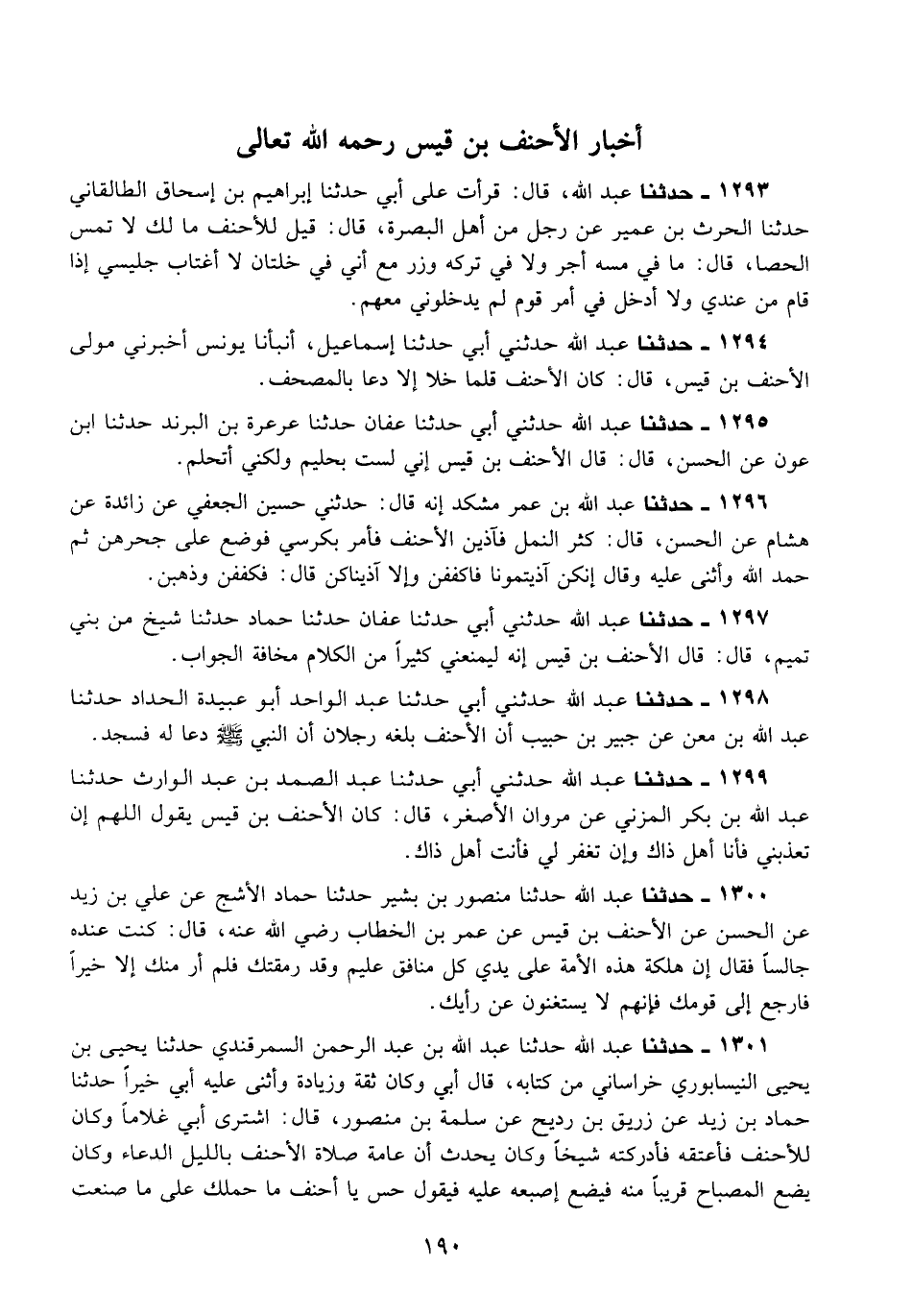 1301 - حَدَّثَنَا عَبْدُ اللَّهِ، حَدَّثَنَا عَبْدُ اللَّهِ بْنُ عَبْدِ الرَّحْمَنِ السَّمَرْقَنْدِيُّ، حَدَّثَنَا يَحْيَى بْنُ يَحْيَى النَّيْسَابُورِيُّ الْخُرَاسَانِيُّ مِنْ كِتَابِهِ، قَالَ أَبِي: وَكَانَ ثِقَةً، وَزِيَادَةً، أَثْنَى عَلَيْهِ أَبِي خَيْرًا، حَدَّثَنَا حَمَّادُ بْنُ زَيْدٍ، عَنْ زُرَيْقِ بْنِ رُدَيْحٍ، عَنْ سَلَمَةَ بْنِ مَنْصُورٍ قَالَ: اشْتَرَى أَبِي غُلَامًا، وَكَانَ لِلْأَحْنَفِ فَأَعْتَقَهُ فَأَدْرَكْتُهُ شَيْخًا، وَكَانَ يُحَدِّثُ أَنَّ §عَامَّةَ صَلَاةِ الْأَحْنَفِ بِاللَّيْلِ الدُّعَاءُ، وَكَانَ يَضَعُ الْمِصْبَاحَ قَرِيبًا مِنْهُ فَيَضَعُ إِصْبَعَهُ عَلَيْهِ فَيَقُولُ حُسَّ يَا أَحْنَفُ مَا حَمَلَكَ عَلَى مَا صَنَعْتَ -[191]- يَوْمَ كَذَا وَكَذَا يَعْنِي كَذَا وَكَذَا "