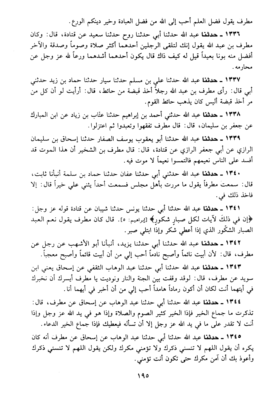 1336 - حَدَّثَنَا عَبْدُ اللَّهِ، حَدَّثَنَا أَبِي، حَدَّثَنَا رَوْحٌ، حَدَّثَنَا سَعِيدٌ، عَنْ قَتَادَةَ قَالَ: وَكَانَ مُطَرِّفُ بْنُ عَبْدِ اللَّهِ يَقُولُ: " إِنَّكَ لَتَلْقَى الرِّجْلَيْنِ أَحَدُهُمَا أَكْثَرُ صَلَاةً وَصَوْمًا وَصَدَقَةً وَالْآخَرُ أَفْضَلُ مِنْهُ بَوْنًا بَعِيدًا، قِيلَ لَهُ: كَيْفَ ذَاكَ؟ قَالَ: «§يَكُونُ أَحَدُهُمَا أَشَدَّهُمَا وَرَعًا لِلَّهِ عَزَّ وَجَلَّ عَنْ مَحَارِمِهِ»
