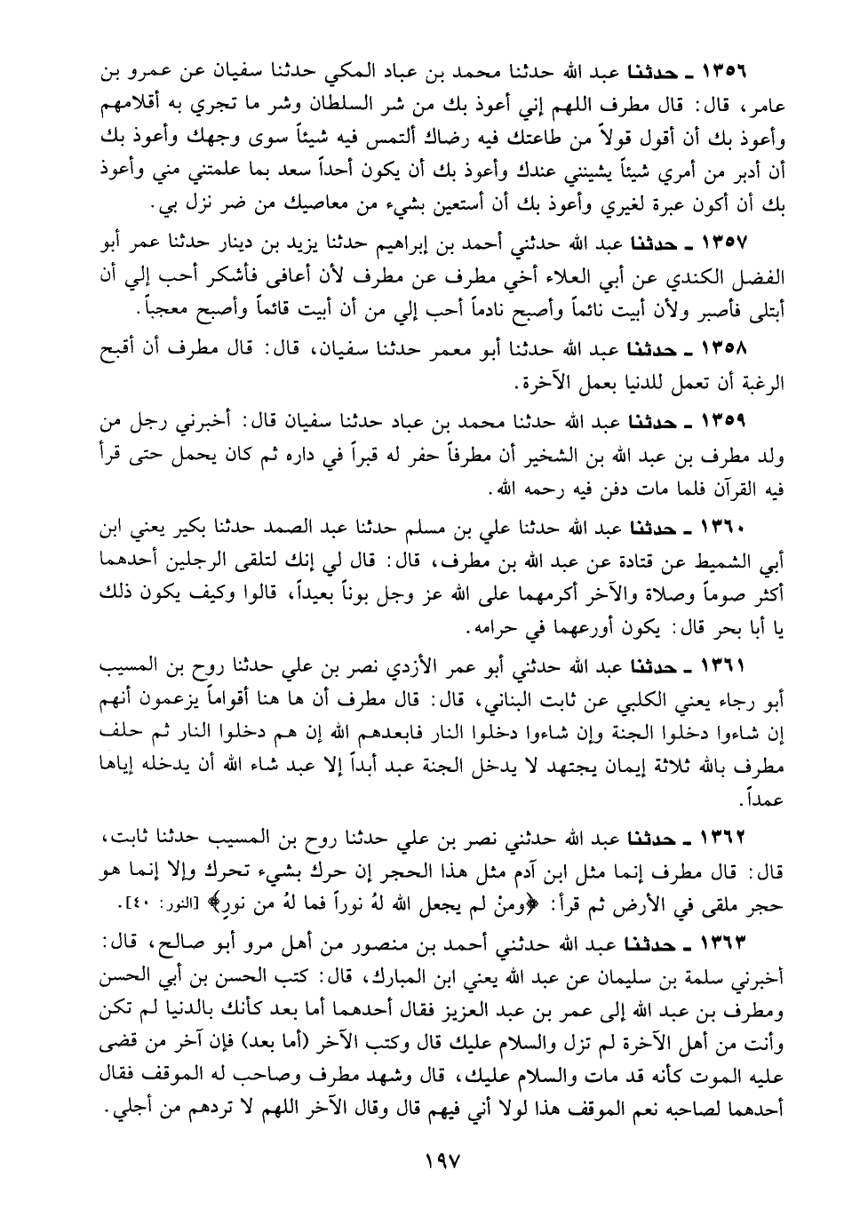 1356 - حَدَّثَنَا عَبْدُ اللَّهِ، حَدَّثَنَا مُحَمَّدُ بْنُ عَبَّادٍ الْمَكِّيُّ، حَدَّثَنَا سُفْيَانُ، عَنْ عَمْرِو بْنِ عَامِرٍ قَالَ: قَالَ مُطَرِّفٌ: «§اللَّهُمَّ إِنِّي أَعُوذُ بِكَ مِنْ شَرِّ السُّلْطَانِ وَشَرِّ مَا تَجْرِي بِهِ أَقْلَامُهُمْ وَأَعُوذُ بِكَ أَنْ أَقُولَ قَوْلًا مِنْ طَاعَتِكَ فِيهِ رِضَاكَ أَلْتَمِسُ فِيهِ شَيْئًا سِوَى وَجْهِكَ وَأَعُوذُ بِكَ أَنْ أُدَبِّرَ مِنْ أَمْرِي شَيْئًا يَشِينُنِي عِنْدِكَ وَأَعُوذُ بِكَ أَنْ يَكُونَ أَحَدٌ سَعِدَ بِمَا عَلَّمْتَنِي مِنِّي، وَأَعُوذُ بِكَ أَنْ أَكُونَ عِبْرَةً لِغَيْرِي وَأَعُوذُ بِكَ أَنْ أَسْتَعِينَ بِشَيْءٍ مِنْ مَعَاصِيكَ مِنْ ضُرٍّ نَزَلَ بِي»