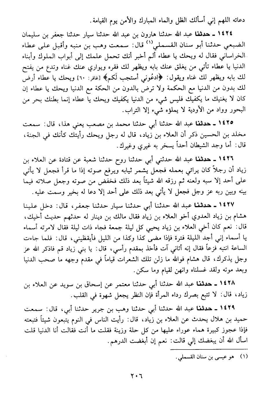 1424 - حَدَّثَنَا عَبْدُ اللَّهِ، حَدَّثَنَا هَارُونُ بْنُ عَبْدِ اللَّهِ، حَدَّثَنَا سَيَّارٌ، حَدَّثَنَا جَعْفَرُ بْنُ سُلَيْمَانَ الضُّبَعِيُّ، حَدَّثَنَا أَبُو سِنَانٍ الْقَسْمَلِيُّ قَالَ: سَمِعْتُ وَهْبَ بْنَ مُنَبِّهٍ، وَأَقْبَلَ، عَلَى عَطَاءٍ الْخُرَاسَانِيِّ فَقَالَ لَهُ: وَيْحَكَ يَا عَطَاءُ أَلَمْ أُخْبَرْ أَنَّكَ تَحْمِلُ عِلْمَكَ إِلَى أَبْوَابِ الْمُلُوكِ وَأَبْنَاءِ الدُّنْيَا، يَا عَطَاءُ §تَأْتِي مَنْ يُغْلِقُ عَنْكَ بَابَهُ وَيُظْهِرُ لَكَ فَقْرَهُ وَيُوَارِي عَنْكَ غِنَاهُ وَتَدَعُ مَنْ يَفْتَحُ لَكَ بَابَهُ وَيُظْهِرُ لَكَ غِنَاهُ وَيَقُولُ {ادْعُونِي أَسْتَجِبْ لَكُمْ} [غافر: 60] وَيْحَكَ يَا عَطَاءُ ارْضَ لَكَ بِدُونٍ مِنَ الدُّنْيَا مَعَ الْحِكْمَةِ وَلَا تَرْضَ بِالدُّونِ مِنَ الْحِكْمَةِ مَعَ الدُّنْيَا، وَيْحَكَ يَا عَطَاءُ إِنْ كَانَ لَا يُغْنِيكَ مَا يَكْفِيكَ فَلَيْسَ شَيْءٌ مِنَ الدُّنْيَا يَكْفِيكَ وَيْحَكَ، يَا عَطَاءُ إِنَّمَا بَطْنُكَ بَحْرٌ مِنَ الْبُحُورِ وَوَادٍ مِنَ الْأَوْدِيَةِ لَا يَمْلَؤُهُ شَيْءٌ إِلَّا التُّرَابُ "