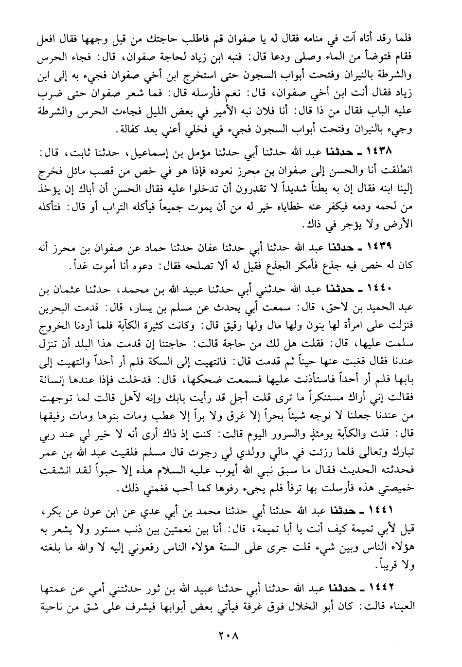 1440 - حَدَّثَنَا عَبْدُ اللَّهِ، حَدَّثَنِي أَبِي، حَدَّثَنَا عُبَيْدُ اللَّهِ بْنُ مُحَمَّدٍ، حَدَّثَنَا عُثْمَانُ بْنُ عَبْدِ الْحَمِيدِ بْنِ لَاحِقٍ قَالَ: سَمِعْتُ أَبِي يُحَدِّثُ، عَنْ مُسْلِمِ بْنِ يَسَارٍ قَالَ: قَدِمْتُ الْبَحْرَيْنِ §فَنَزَلْتُ عَلَى امْرَأَةٍ لَهَا بَنُونَ وَلَهَا مَالٌ وَلَهَا رَقِيقٌ قَالَ: وَكَانَتْ كَثِيرَةَ الْكَآبَةِ فَلَمَّا أَرَدْنَا الْخُرُوجَ سَلَّمْتُ عَلَيْهَا قَالَ: فَقُلْتُ: هَلْ لَكِ مِنْ حَاجَةٍ؟ قَالَتْ: حَاجَتُنَا إِنْ قَدِمْتَ هَذَا الْبَلَدَ أَنْ تَنْزِلَ عِنْدَنَا فَقَالَ: فَغِبْتُ عَنْهَا حِينًا ثُمَّ قَدِمْتُ قَالَ: فَانْتَهَيْتُ إِلَى السِّكَّةِ فَلَمْ أَرَ أَحَدًا وَانْتَهَيْتُ إِلَى بَابِهَا فَلَمْ أَرَ أَحَدًا فَاسْتَأْذَنْتُ عَلَيْهَا فَسَمِعْتُ ضَحِكَهَا قَالَ: فَدَخَلْتُ فَإِذَا عِنْدَهَا إِنْسَانَةٌ فَقَالَتْ: إِنِّي أَرَاكَ مُسْتَنْكِرًا مَا تَرَى قُلْتُ: أَجَلْ قَدْ رَأَيْتُ بَابَكِ وَإِنَّهُ لَآهِلٌ، قَالَتْ: لَمَّا تَوَجَّهْتَ مِنْ عِنْدِنَا جَعَلْنَا لَا نُوَجِّهُ شَيْئًا بَحْرًا إِلَّا غَرِقَ وَلَا بَرًّا إِلَّا عَطِبَ وَمَاتَ بَنُوهَا وَمَاتَ رَقِيقُهَا قَالَ: قُلْتُ: الْكَآبَةُ يَؤْمَئِذٍ وَالسُّرُورُ الْيَوْمَ؟ قَالَتْ: كُنْتُ إِذْ ذَاكَ أَرَى أَنَّهُ لَا خَيْرَ لِي عِنْدَ رَبِّي تَبَارَكَ وَتَعَالَى فَلَمَّا رُزِئْتُ فِي مَالِي وَوَلَدِي لِي رَجَوْتُ، قَالَ مُسْلِمٌ: فَلَقِيتُ عَبْدَ اللَّهِ بْنَ عُمَرَ فَحَدَّثْتُهُ الْحَدِيثَ فَقَالَ: مَا سَبَقَ نَبِيَّ اللَّهِ أَيُّوبَ عَلَيْهِ السَّلَامُ هَذِهِ إِلَّا حَبْوًا لَقَدْ انْشَقَّتْ خَمِيصَتِي هَذِهِ فَأَرْسَلْتُ بِهَا تُرْفَأُ فَلَمْ يَجِئْ رَفَؤُهَا كَمَا أُحِبُّ فَغَمَّنِي ذَلِكَ "