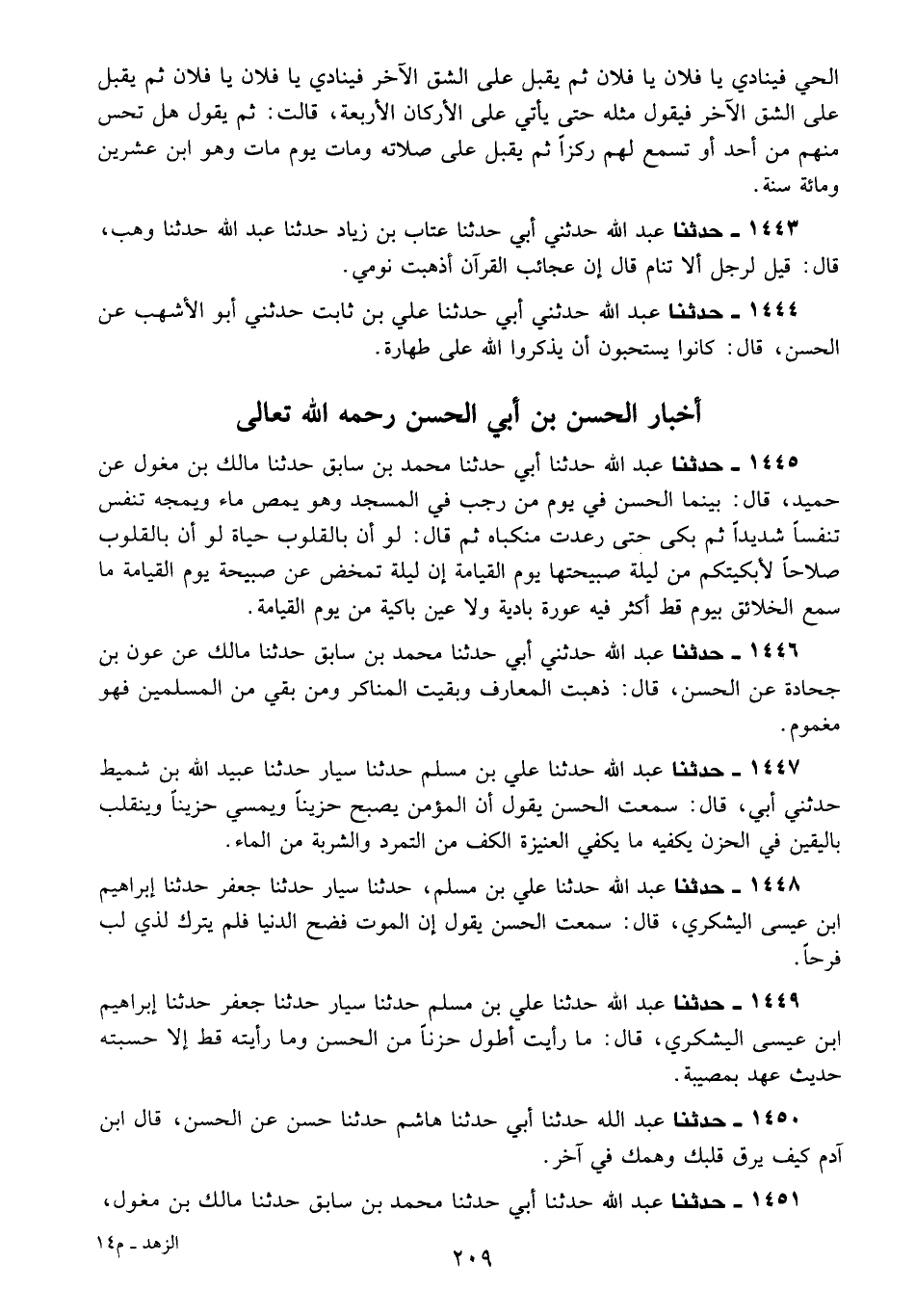1445 - حَدَّثَنَا عَبْدُ اللَّهِ، حَدَّثَنَا أَبِي، حَدَّثَنَا مُحَمَّدُ بْنُ سَابِقٍ، حَدَّثَنَا مَالِكُ بْنُ مِغْوَلٍ، عَنْ حُمَيْدٍ قَالَ: بَيْنَمَا الْحَسَنُ فِي يَوْمٍ مِنْ رَجَبٍ فِي الْمَسْجِدِ وَهُوَ يَمُصُّ مَاءً وَيَمُجُّهُ تَنَفَّسَ تَنَفُّسًا شَدِيدًا ثُمَّ بَكَى حَتَّى رُعِدَتْ مَنْكِبَاهُ ثُمَّ قَالَ: «§لَوْ أَنَّ بِالْقُلُوبِ حَيَاةً لَوْ أَنَّ بِالْقُلُوبِ صَلَاحًا لَأَبْكَيْتُكُمْ مِنْ لَيْلَةٍ صَبِيحَتُهَا يَوْمُ الْقِيَامَةِ إِنَّ لَيْلَةً تُمْخَضُ عَنْ صَبِيحَةِ يَوْمِ الْقِيَامَةِ مَا سَمِعَ الْخَلَائِقُ بِيَوْمٍ قَطُّ أَكْثَرَ، فِيهِ عَوْرَةٌ بَادِيَةٌ وَلَا عَيْنٌ بَاكِيَةٌ مِنْ يَوْمِ الْقِيَامَةِ»