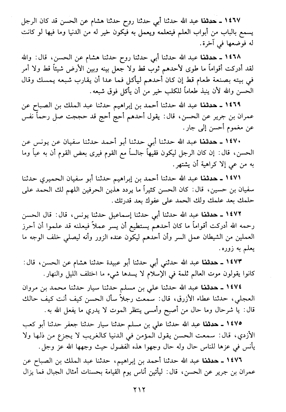 1476 - حَدَّثَنَا عَبْدُ اللَّهِ، حَدَّثَنَا أَحْمَدُ بْنُ إِبْرَاهِيمَ، حَدَّثَنَا عَبْدُ الْمَلِكِ بْنُ الصَّبَّاحِ، عَنْ عِمْرَانَ بْنِ حُدَيْرٍ، عَنِ الْحَسَنِ قَالَ: «§لَيَأْتِيَنَّ أُنَاسٌ يَوْمَ الْقِيَامَةِ بِحَسَنَاتٍ أَمْثَالِ الْجِبَالِ فَمَا يَزَالُ -[213]- يُؤْخَذُ مِنْهُمْ لِمَنْ ظَلَمُوا حَتَّى يَبْقَى مُفْلِسًا يُفْتَلَ إِلَى النَّارِ»