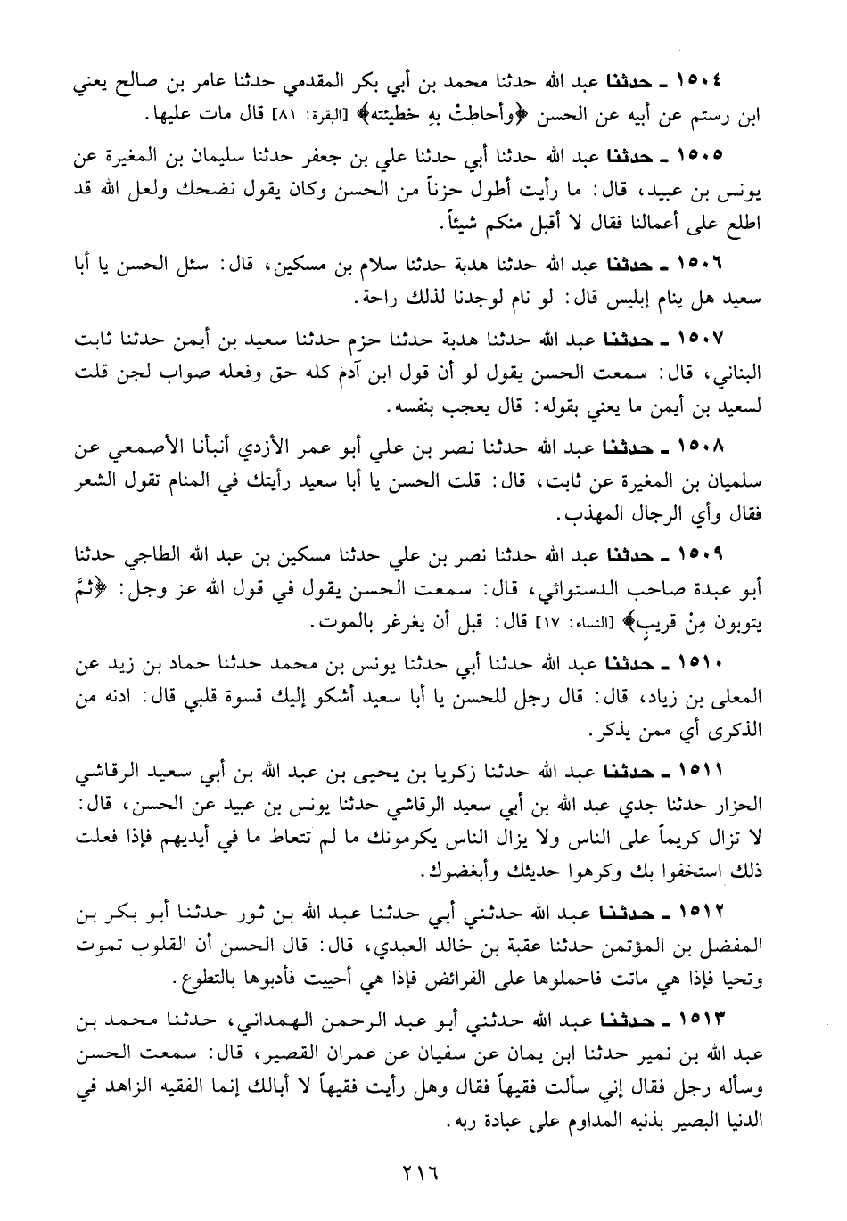 1506 - حَدَّثَنَا عَبْدُ اللَّهِ، حَدَّثَنَا هُدْبَةُ، حَدَّثَنَا سَلَّامُ بْنُ مِسْكِينٍ قَالَ: سُئِلَ الْحَسَنُ: يَا أَبَا سَعِيدٍ، " §هَلْ يَنَامُ إِبْلِيسُ؟ قَالَ: لَوْ نَامَ لَوَجَدْنَا لِذَلِكَ رَاحَةً "