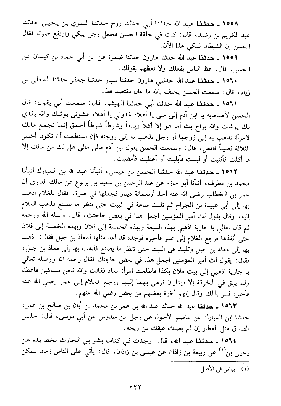 1558 - حَدَّثَنَا عَبْدُ اللَّهِ، حَدَّثَنَا أَبِي، حَدَّثَنَا رَوْحٌ، حَدَّثَنَا السَّرِيُّ بْنُ يَحْيَى، حَدَّثَنَا عَبْدُ الْكَرِيمِ بْنُ رُشَيْدٍ قَالَ: كُنْتُ فِي حَلْقَةِ الْحَسَنِ فَجَعَلَ رَجُلٌ يَبْكِي وَارْتَفَعَ صَوْتُهُ فَقَالَ الْحَسَنُ: «§إِنَّ الشَّيْطَانَ لَيُبْكِي هَذَا الْآنَ»
