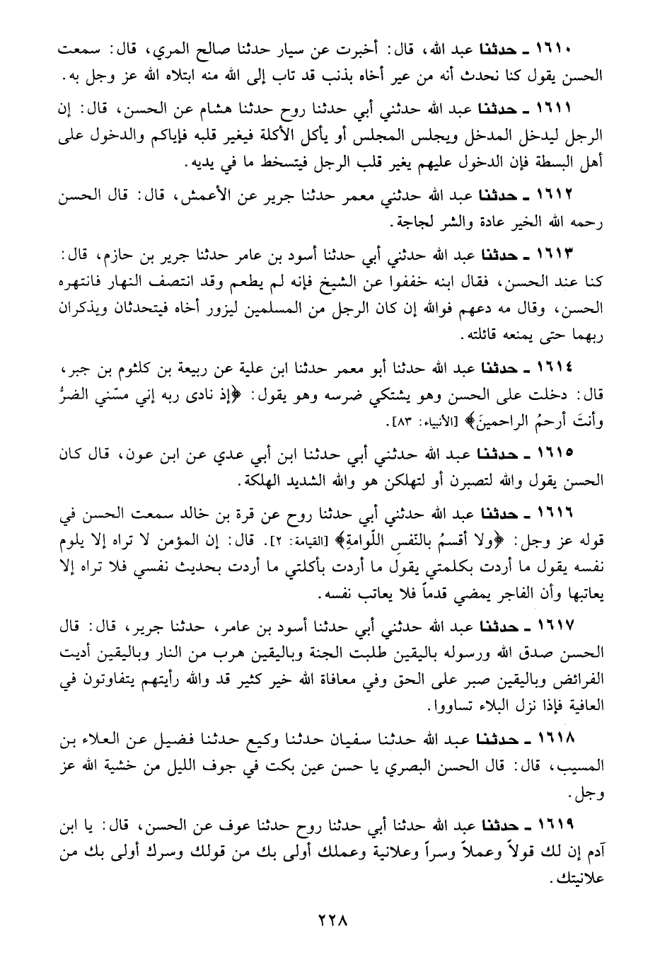 1616 - حَدَّثَنَا عَبْدُ اللَّهِ، حَدَّثَنَي أَبِي، حَدَّثَنَا رَوْحٌ، عَنْ قُرَّةَ بْنِ خَالِدٍ، سَمِعْتُ الْحَسَنَ، فِي قَوْلِهِ عَزَّ وَجَلَّ: {§وَلَا أُقْسِمُ بِالنَّفْسِ اللَّوَّامَةِ} [القيامة: 2] قَالَ: " إِنَّ الْمُؤْمِنَ لَا تَرَاهُ إِلَّا يَلُومُ نَفْسَهُ يَقُولُ: مَا أَرَدْتُ بِكَلِمَتِي، يَقُولُ: مَا أَرَدْتُ بِأَكْلَتِي، مَا أَرَدْتُ بِحَدِيثِ نَفْسِي، فَلَا تَرَاهُ إِلَّا يُعَاتِبُهَا، وَإِنَّ الْفَاجِرَ يَمْضِي قُدُمًا فَلَا يُعَاتِبُ نَفْسَهُ "