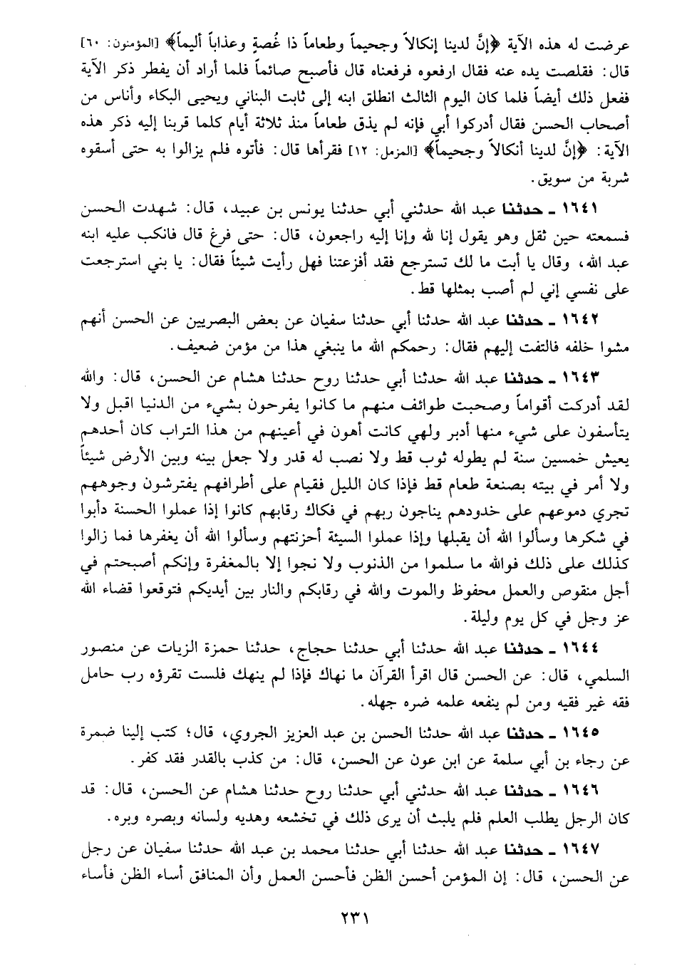 1643 - حَدَّثَنَا عَبْدُ اللَّهِ، حَدَّثَنَا أَبِي، حَدَّثَنَا رَوْحٌ، حَدَّثَنَا هِشَامٌ، عَنِ الْحَسَنِ قَالَ: «وَاللَّهِ، لَقَدْ §أَدْرَكْتُ أَقْوَامًا وَصَحِبْتُ طَوَائِفَ مِنْهُمْ مَا كَانُوا يَفْرَحُونَ بِشَيْءٍ مِنَ الدُّنْيَا أَقْبَلَ وَلَا يَتَأَسَّفُونَ عَلَى شَيْءٍ مِنْهَا أَدْبَرَ، وَلَهِيَ كَانَتْ أَهْوَنَ فِي أَعْيُنِهِمْ مِنَ هَذَا التُّرَابِ، كَانَ أَحَدُهُمْ يَعِيشُ خَمْسِينَ سَنَةً لَمْ يُطْوَ لَهُ ثَوْبٌ قَطُّ، وَلَا نُصِبَ لَهُ قِدْرٌ، وَلَا جَعَلَ بَيْنَهُ وَبَيْنَ الْأَرْضِ شَيْئًا وَلَا أَمَرَ فِي بَيْتِهِ بِصَنْعَةِ طَعَامٍ قَطُّ، فَإِذَا كَانَ اللَّيْلُ فَقِيَامٌ عَلَى أَطْرَافِهِمْ يَفْتَرِشُونَ وُجُوهَهُمْ تَجْرِي دُمُوعُهُمْ عَلَى خُدُودِهِمْ يُنَاجُونَ رَبَّهُمْ فِي فِكَاكِ رِقَابِهِمْ كَانُوا إِذَا عَمِلُوا الْحَسَنَةَ دَأَبُوا فِي شُكْرِهَا وَسَأَلُوا اللَّهَ أَنْ يَقْبَلَهَا، وَإِذَا عَمِلُوا السَّيِّئَةَ أَحْزَنَتْهُمْ وَسَأَلُوا اللَّهَ أَنْ يَغْفِرَهَا فَمَا زَالُوا كَذَلِكَ عَلَى ذَلِكَ فَوَاللَّهِ مَا سَلِمُوا مِنَ الذُّنُوبِ وَلَا نَجَوْا إِلَّا بِالْمَغْفِرَةِ وَإِنَّكُمْ أَصْبَحْتُمْ فِي أَجَلٍ مَنْقُوصٍ، وَالْعَمَلُ مَحْفُوظٌ وَالْمَوْتُ وَاللَّهِ فِي رِقَابِكُمْ وَالنَّارُ بَيْنَ أَيْدِيكُمْ فَتَوَقَّعُوا قَضَاءَ اللَّهِ عَزَّ وَجَلَّ فِي كُلِّ يَوْمٍ وَلَيْلَةٍ»