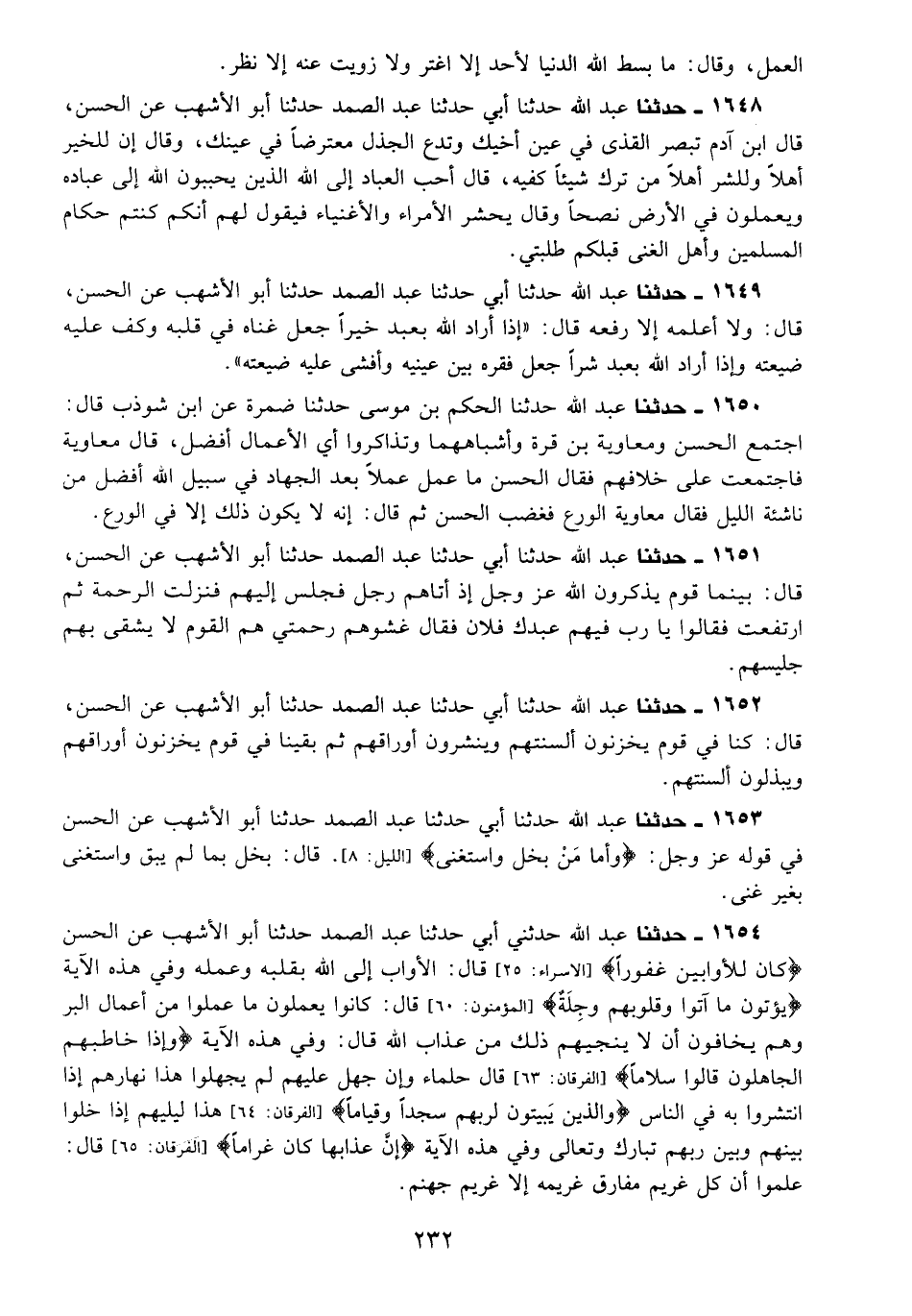 1653 - حَدَّثَنَا عَبْدُ اللَّهِ، حَدَّثَنَا أَبِي، حَدَّثَنَا عَبْدُ الصَّمَدِ، حَدَّثَنَا أَبُو الْأَشْهَبِ، عَنِ الْحَسَنِ، فِي قَوْلِهِ عَزَّ وَجَلَّ: {§وَأَمَّا مَنْ بَخِلَ وَاسْتَغْنَى} [الليل: 8] قَالَ: «بَخِلَ بِمَا لَمْ يَبْقَ وَاسْتَغْنَى بِغَيْرِ غِنًى»