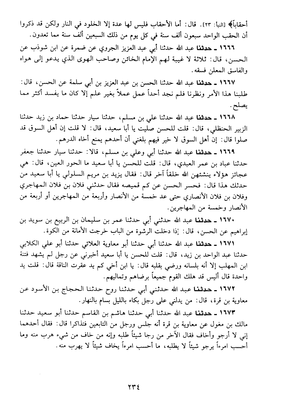 1668 - حَدَّثَنَا عَبْدُ اللَّهِ، حَدَّثَنَا عَلِيُّ بْنُ مُسْلِمٍ، حَدَّثَنَا سَيَّارٌ، حَدَّثَنَا حَمَّادُ بْنُ زَيْدٍ، حَدَّثَنَا الزُّبَيْرُ الْحَنْظَلِيُّ قَالَ: قُلْتُ لِلْحَسَنِ: صَلَّيْتَ يَا أَبَا سَعِيدٍ؟ قَالَ: لَا، قُلْتُ: إِنَّ أَهْلَ السُّوقِ قَدْ صَلَّوْا قَالَ: «§إِنَّ أَهْلَ السُّوقِ لَا خَيْرَ فِيهِمْ بَلَغَنِي أَنَّ أَحَدَهُمْ يَمْنَعُ أَخَاهُ الدِّرْهَمَ»