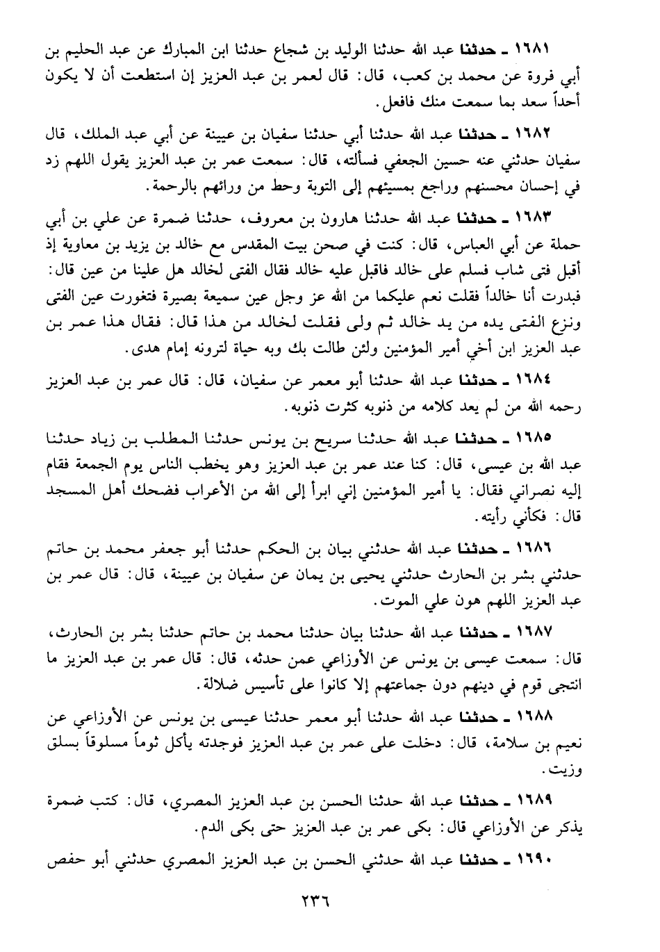 1689 - حَدَّثَنَا عَبْدُ اللَّهِ، حَدَّثَنَا الْحَسَنُ بْنُ عَبْدِ الْعَزِيزِ الْمِصْرِيُّ قَالَ: كَتَبَ ضَمْرَةُ يَذْكُرُ عَنِ الْأَوْزَاعِيِّ قَالَ: §بَكَى عُمَرُ بْنُ عَبْدِ الْعَزِيزِ حَتَّى بَكَى الدَّمَ "