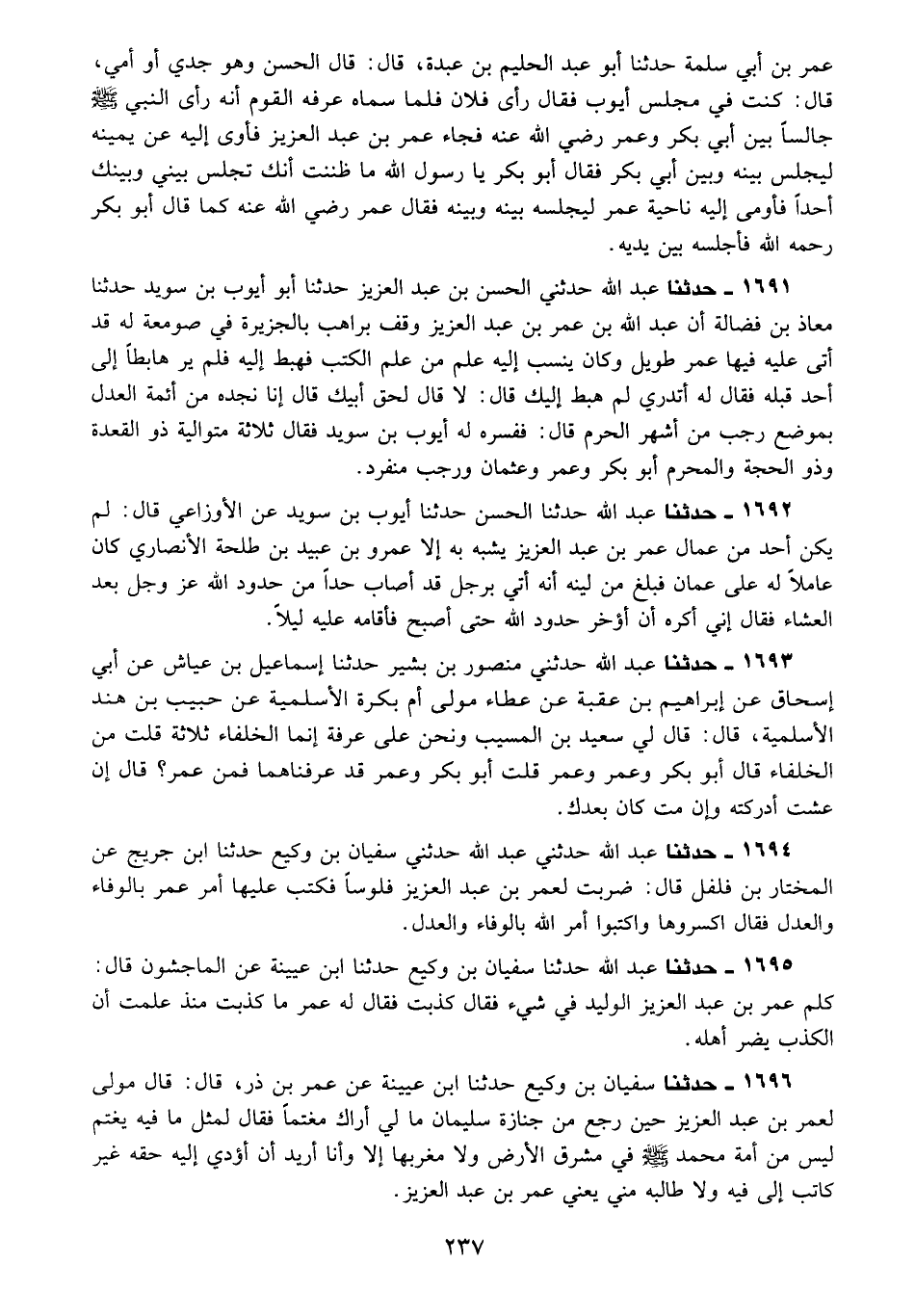 1692 - حَدَّثَنَا عَبْدُ اللَّهِ، حَدَّثَنَا الْحَسَنُ، حَدَّثَنَا أَيُّوبُ بْنُ سُوَيْدٍ، عَنِ الْأَوْزَاعِيِّ قَالَ: لَمْ يَكُنْ أَحَدٌ مِنْ عُمَّالِ عُمَرَ بْنِ عَبْدِ الْعَزِيزِ يُشْبِهُ بِهِ إِلَّا عَمْرَو بْنَ عُبَيْدِ بْنِ طَلْحَةَ الْأَنْصَارِيَّ كَانَ عَامِلًا لَهُ عَلَى عُمَانَ فَبَلَغَ مِنْ لِينِهِ أَنَّهُ أُتِيَ بِرَجُلٍ قَدْ أَصَابَ حَدًّا مِنْ حُدُودِ اللَّهِ عَزَّ وَجَلَّ بَعْدَ الْعِشَاءِ فَقَالَ: «§إِنِّي أَكْرَهُ أَنْ أُؤَخِّرَ حُدُودَ اللَّهِ حَتَّى أُصْبِحَ فَأَقَامَهُ عَلَيْهِ لَيْلًا»