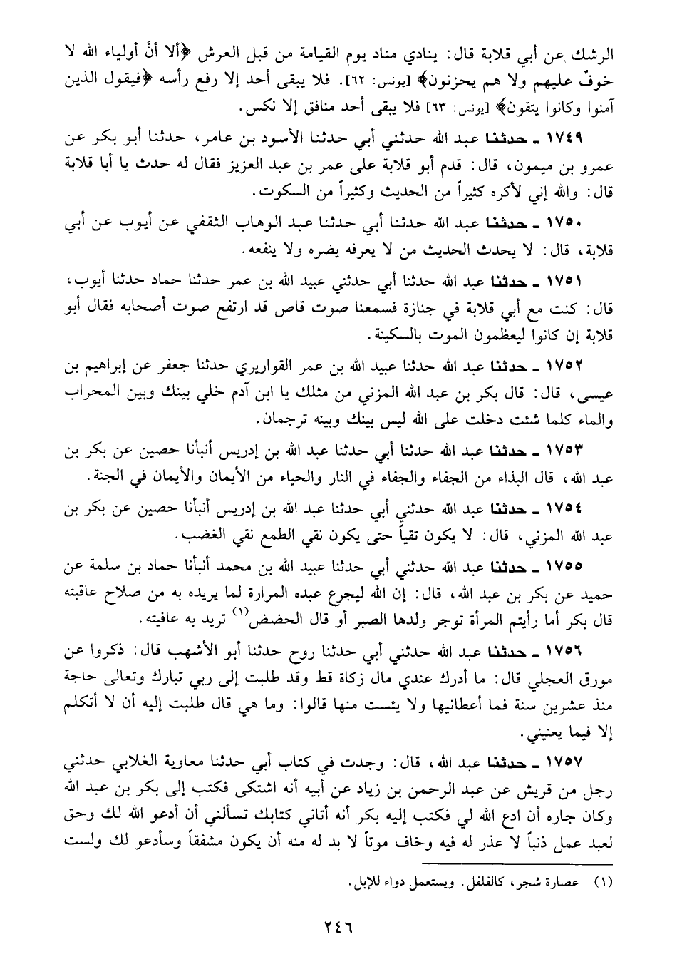 1750 - حَدَّثَنَا عَبْدُ اللَّهِ، حَدَّثَنَا أَبِي، حَدَّثَنَا عَبْدُ الْوَهَّابِ الثَّقَفِيُّ، عَنْ أَيُّوبَ، عَنْ أَبِي قِلَابَةَ قَالَ: «§لَا يُحَدِّثُ الْحَدِيثَ مَنْ لَا يَعْرِفُهُ، يَضُرُّهُ وَلَا يَنْفَعُهُ»