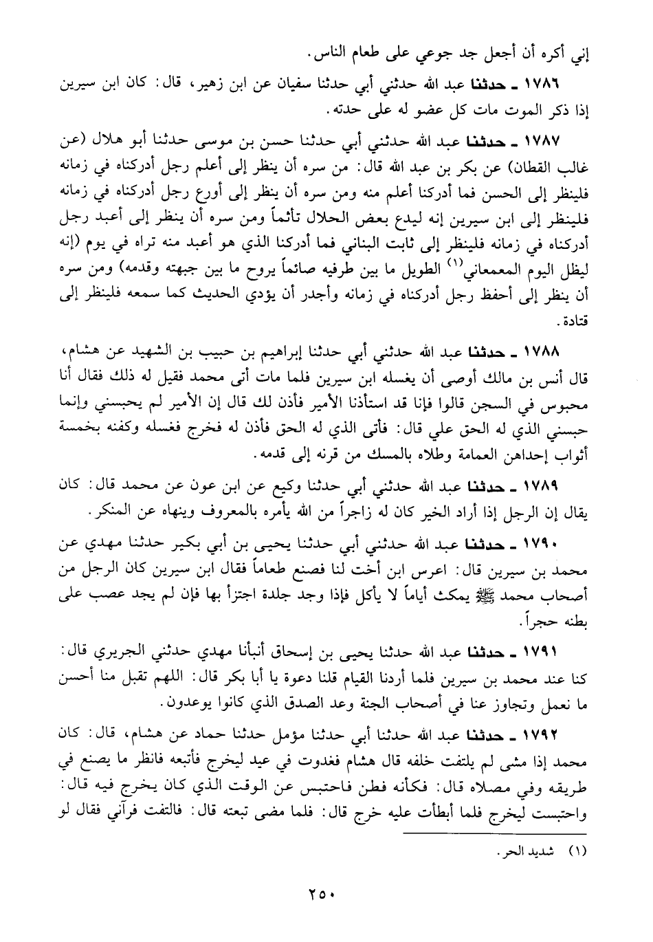 1790 - حَدَّثَنَا عَبْدُ اللَّهِ، حَدَّثَنِي أَبِي، حَدَّثَنَا يَحْيَى بْنُ أَبِي بُكَيْرٍ، حَدَّثَنَا مَهْدِيٌّ، عَنْ مُحَمَّدِ بْنِ سِيرِينَ قَالَ: " أَعْرَسَ ابْنُ أُخْتٍ لَنَا فَصَنَعَ طَعَامًا فَقَالَ ابْنُ سِيرِينَ: كَانَ الرَّجُلُ مِنْ أَصْحَابِ مُحَمَّدٍ صَلَّى اللَّهُ عَلَيْهِ وَسَلَّمَ §يَمْكُثُ أَيَّامًا لَا يَأْكُلُ فَإِذَا وَجَدَ جِلْدَةً اجْتَزَأَ بِهَا فَإِنْ لَمْ يَجِدْ عَصَبَ عَلَى بَطْنِهِ حَجَرًا