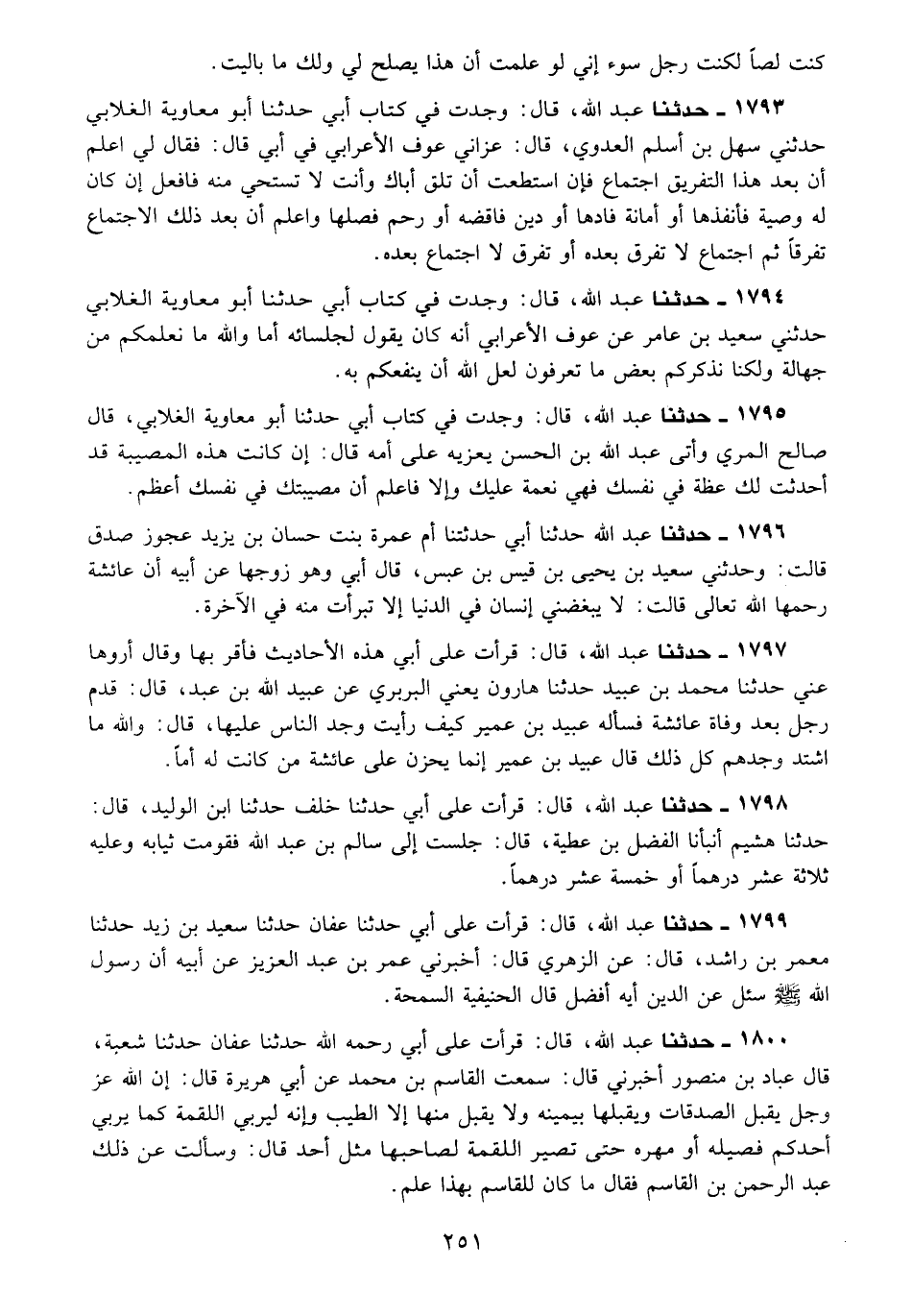 1794 - حَدَّثَنَا عَبْدُ اللَّهِ، قِالِ وَجَدْتُ فِي كِتَابِ أَبِي، حَدَّثَنَا أَبُو مُعَاوِيَةَ الْغَلَابِيُّ، حَدَّثَنِي سَعِيدُ بْنُ عَامِرٍ، عَنْ عَوْفٍ الْأَعْرَابِيِّ، أَنَّهُ كَانَ يَقُولُ لِجُلَسَائِهِ: «أَمَا وَاللَّهِ §مَا نُعَلِّمُكُمْ مِنْ جَهَالَةٍ وَلَكِنَّا نُذَكِّرُكُمْ بَعْضَ مَا تَعْرِفُونَ لَعَلَّ اللَّهَ أَنْ يَنْفَعَكُمْ بِهِ»