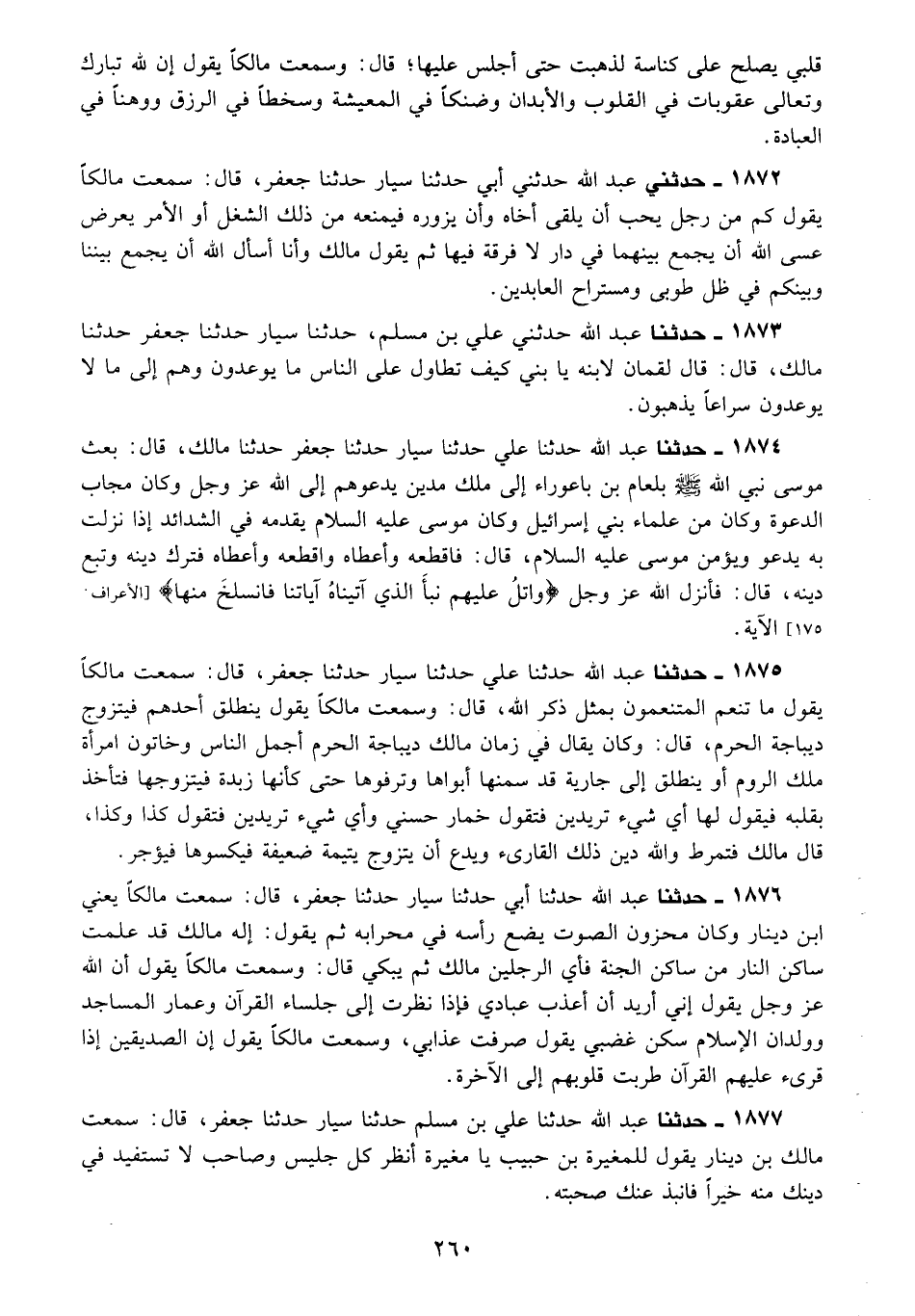 1872 - حَدَّثَنَا عَبْدُ اللَّهِ، حَدَّثَنِي أَبِي، حَدَّثَنَا سَيَّارٌ، حَدَّثَنَا جَعْفَرٌ قَالَ: سَمِعْتُ مَالِكًا، يَقُولُ: " §كَمْ مِنْ رَجُلٍ يُحِبُّ أَنْ يَلْقَى أَخَاهُ وَأَنْ يَزُورَهُ فَيَمْنَعَهُ مِنْ ذَلِكَ الشُّغْلُ أَوِ الْأَمْرُ يَعْرِضُ عَسَى اللَّهُ أَنْ يَجْمَعَ بَيْنَهُمَا فِي دَارٍ لَا فُرْقَةَ فِيهَا، ثُمَّ يَقُولُ مَالِكٌ: وَأَنَا أَسْأَلُ اللَّهَ أَنْ يَجْمَعَ بَيْنَنَا وَبَيْنَكُمْ فِي ظِلِّ طُوبَى وَمُسْتَرَاحِ الْعَابِدِينَ "