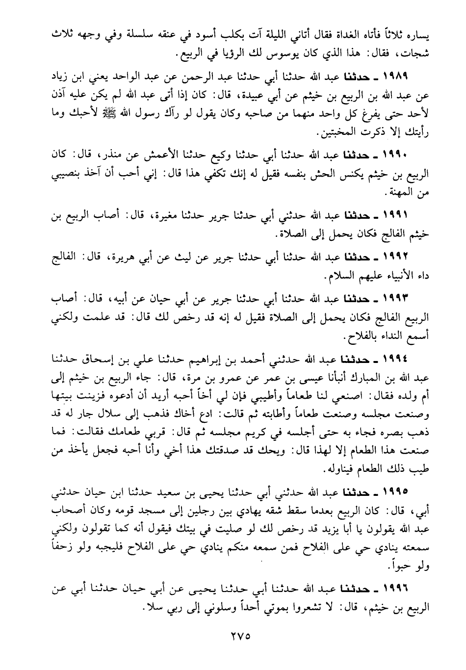 1991 - حَدَّثَنَا عَبْدُ اللَّهِ، حَدَّثَنِي أَبِي، حَدَّثَنَا جَرِيرٌ، حَدَّثَنَا مُغِيرَةُ قَالَ: §أَصَابَ الرَّبِيعَ بْنَ خُثَيْمٍ الْفَالِجُ، فَكَانَ يُحْمَلُ إِلَى الصَّلَاةِ "