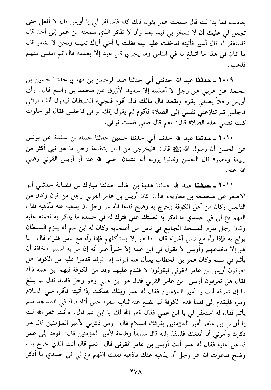 2011 - حَدَّثَنَا عَبْدُ اللَّهِ، حَدَّثَنَا هُدْبَةُ بْنُ خَالِدٍ، حَدَّثَنَا مُبَارَكُ بْنُ فَضَالَةَ، حَدَّثَنِي أَبُو الْأَصْفَرِ، عَنْ صَعْصَعَةَ بْنِ مُعَاوِيَةَ قَالَ: كَانَ أُوَيْسُ بْنُ عَامِرٍ الْقَرَنِيُّ رَجُلٌ مِنْ قَرْنٍ وَكَانَ مِنَ التَّابِعِينَ وَكَانَ مِنْ أَهْلِ الْكُوفَةِ وَخَرَجَ بِهِ وَضَحٌ، فَدَعَا اللَّهَ عَزَّ وَجَلَّ أَنْ يُذْهِبَهُ عَنْهُ فَأَذْهَبَهُ فَقَالَ: اللَّهُمَّ دَعْ لِي فِي جَسَدِي مَا أَذْكُرُ بِهِ نِعْمَتَكَ عَلَيَّ، فَتَرَكَ لَهُ فِي جَسَدِهِ مَا يَذْكُرُ بِهِ نِعْمَتَهُ عَلَيْهِ، وَكَانَ رَجُلًا يَلْزَمُ الْمَسْجِدَ الْجَامِعَ فِي نَاسٍ مِنْ أَصْحَابِهِ وَكَانَ لَهُ ابْنُ عَمٍّ لَهُ يَلْزَمُ السُّلْطَانَ يُولَعُ بِهِ فَإِذَا رَآهُ مَعَ نَاسٍ أَغْنِيَاءَ قَالَ: مَا هُوَ إِلَّا يَسْتَأْكِلُهُمْ، فَإِذَا رَآهُ مَعَ نَاسٍ فُقَرَاءَ قَالَ: مَا هُوَ إِلَّا يَخْدَعُهُمْ، وأُوَيْسٌ لَا يَقُولُ فِي ابْنِ عَمِّهِ إِلَّا خَيْرًا غَيْرَ أَنَّهُ إِذَا مَرَّ بِهِ اسْتَتَرَ مَخَافَةَ أَنْ يَأْثَمَ فِي سَبَبِهِ، وَكَانَ عُمَرُ بْنُ الْخَطَّابِ يَسْأَلُ عَنْهُ الْوَفْدَ قَدِمُوا عَلَيْهِ مِنَ الْكُوفَةِ هَلْ تَعْرِفُونَ أُوَيْسَ بْنَ عَامِرٍ الْقَرَنِيَّ؟ فَيَقُولُونَ: لَا، فَقَدِمَ عَلَيْهِمْ وَفْدٌ مِنَ الْكُوفَةِ فِيهِمْ ابْنُ عَمِّهِ ذَاكَ فَقَالَ: هَلْ تَعْرِفُونَ أُوَيْسَ بْنَ عَامِرٍ الْقَرَنِيَّ؟ فَقَالَ: هُوَ ابْنُ عَمِيَ وَهُوَ رَجُلٌ فَاسِدٌ نَذْلٌ لَمْ يَبْلُغْ مَا إِنْ تَعْرِفُهُ أَنْتَ يَا أَمِيرَ الْمُؤْمِنِينَ، فَقَالَ لَهُ عُمَرُ: وَيْلَكَ هَلَكْتَ إِذَا أَتَيْتَهُ فَأَقْرِئْهُ مِنِّي السَّلَامَ وَمُرْهُ فَلْيَقْدَمْ إِلَيَّ، فَلَمَّا قَدِمَ الْكُوفَةَ لَمْ يَضَعْ عَنْهُ ثِيَابَ سَفَرِهِ حَتَّى أَتَاهُ فَرَآهُ فِي الْمَسْجِدِ فَلَمْ يَأْتَمَّ فَقَالَ لَهُ: اسْتَغْفِرْ لِي يَا ابْنَ عَمِّي، فَقَالَ: غَفَرَ اللَّهُ لَكَ يَا ابْنَ عَمِّي قَالَ: وَأَنْتَ غَفَرَ اللَّهُ لَكَ يَا أُوَيْسُ بْنَ عَامِرٍ، أَمِيرُ الْمُؤْمِنِينَ يُقْرِئُكَ السَّلَامَ قَالَ: وَمَنْ ذَكَرَنِي لِأَمِيرِ الْمُؤْمِنِينَ؟ قَالَ: هُوَ ذَكَرَكَ وَأَمَرَنِي أَنْ أُبْلِغَكَ فَلْتَنْفُذْ إِلَيْهِ قَالَ: سَمْعًا وَطَاعَةً لِأَمِيرِ الْمُؤْمِنِينَ قَالَ: فَوَفَدَ إِلَى عُمَرَ فَدَخَلَ عَلَيْهِ فَقَالَ لَهُ عُمَرُ: أَنْتَ أُوَيْسُ بْنُ عَامِرٍ الْقَرَنِيُّ؟ قَالَ: نَعَمْ، قَالَ أَنْتَ الَّذِي خَرَجَ بِكَ وَضَحٌ فَدَعَوْتَ اللَّهَ عَزَّ وَجَلَّ أَنْ يُذْهِبَهُ عَنْكَ فَأَذْهَبَهُ فَقُلْتَ: اللَّهُمَّ دَعْ لِي فِي جَسَدِي مَا أَذْكُرُ -[279]- بِهِ نِعْمَتَكَ عَلَيَّ فَتَرَكَ فِي جَسَدِكَ مَا تَذْكُرُ بِهِ نِعْمَةَ اللَّهِ عَلَيْكَ؟ قَالَ: وَمَا أَدْرَاكَ يَا أَمِيرَ الْمُؤْمِنِينَ فَوَاللَّهِ مَا اطَّلَعَ عَلَى هَذَا بِشْرٌ؟ قَالَ: أَخْبَرَنَا رَسُولُ اللَّهِ صَلَّى اللَّهُ عَلَيْهِ وَسَلَّمَ أَنَّهُ سَيَكُونُ فِي التَّابِعِينَ رَجُلٌ مِنْ قَرْنٍ يُقَالُ لَهُ §أُوَيْسُ بْنُ عَامِرٍ الْقَرَنِيُّ يَخْرُجُ بِهِ وَضَحٌ فَيَدْعُو اللَّهَ أَنْ يُذْهِبَهُ فَيُذْهِبَهُ عَنْهُ فَيَقُولُ: اللَّهُمَّ دَعْ لِي فِي جَسَدِي مَا أَذْكُرُ بِهِ نِعْمَتَكَ عَلَيَّ فَيَدَعُ لَهُ فِي جَسَدِهِ مَا يَذْكُرُ بِهِ نِعْمَتَهُ عَلَيْهِ فَمَنْ أَدْرَكَهُ مِنْكُمْ واسْتَطَاعَ أَنْ يَسْتَغْفِرَ لَهُ فَلْيَسْتَغْفِرْ لَهُ، فَاسْتَغْفِرْ لِي يَا أُوَيْسُ بْنَ عَامِرٍ قَالَ: غَفَرَ اللَّهُ لَكَ يَا أَمِيرَ الْمُؤْمِنِينَ قَالَ: وَأَنْتَ يَغْفِرُ اللَّهُ لَكَ يَا أُوَيْسُ بْنَ عَامِرٍ، فَلَمَّا سَمِعُوا مِنْ عُمَرَ مَا قَالَ عَنْ رَسُولِ اللَّهِ صَلَّى اللَّهُ عَلَيْهِ وَسَلَّمَ قَالَ رَجُلٌ: اسْتَ