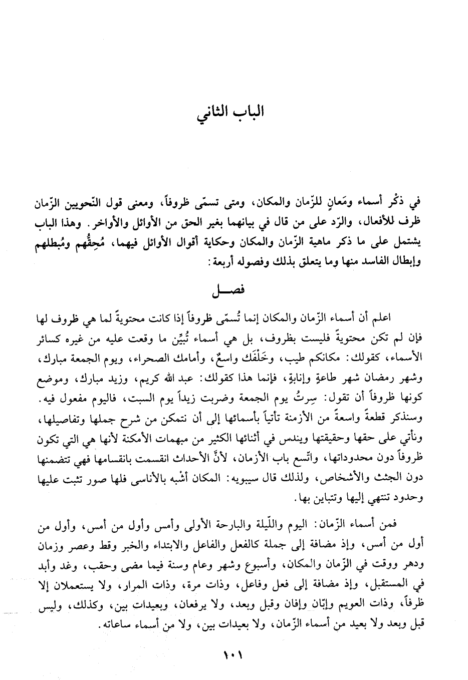 ومتى تسمّى ظروفا، ومعنى قول النّحويين الزّمان ظرف للأفعال، والرّد على من قال في بيانهما بغير الحق من الأوائل والأواخر. وهذا الباب يشتمل على ما ذكر ماهية الزّمان والمكان وحكاية أقوال الأوائل فيهما، محقّهم ومبطلهم وإبطال الفاسد منها وما يتعلق بذلك وفصوله أربعة: