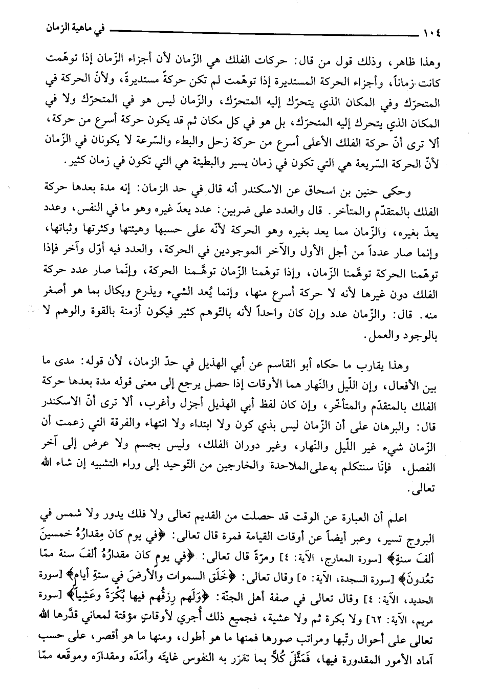 وهذا ظاهر، وذلك قول من قال: حركات الفلك هي الزّمان لأن أجزاء الزّمان إذا توهّمت كانت زمانا، وأجزاء الحركة المستديرة إذا توهّمت لم تكن حركة مستديرة، ولأنّ الحركة في المتحرّك وفي المكان الذي يتحرّك إليه المتحرّك، والزّمان ليس هو في المتحرّك ولا في المكان الذي يتحرك إليه المتحرّك، بل هو في كل مكان ثم قد يكون حركة أسرع من حركة، ألا ترى أنّ حركة الفلك الأعلى أسرع من حركة زحل والبطء والسّرعة لا يكونان في الزّمان لأنّ الحركة السّريعة هي التي تكون في زمان يسير والبطيئة هي التي تكون في زمان كثير.