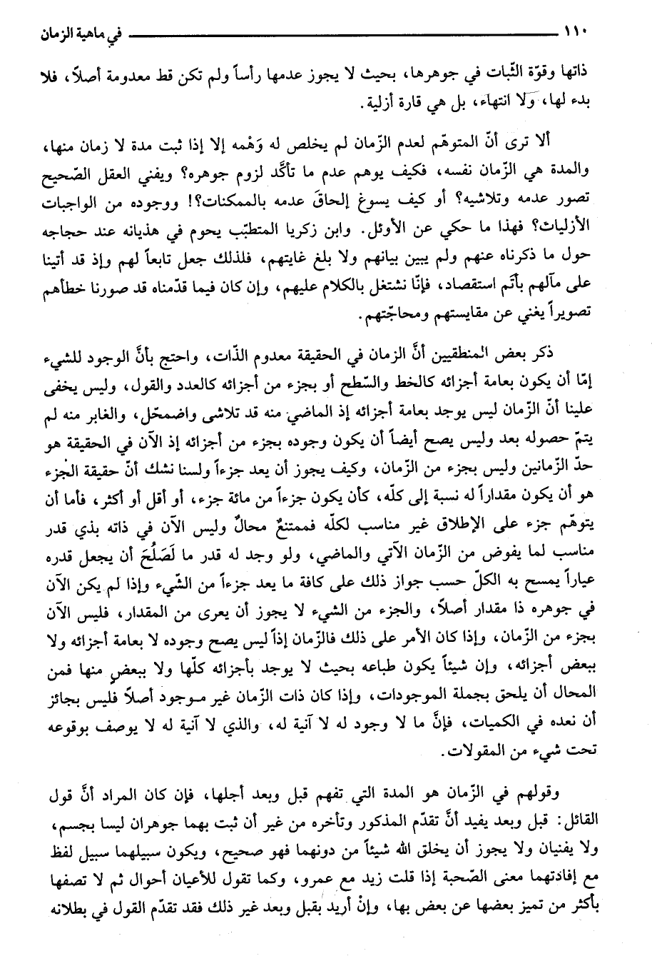 ذكر بعض المنطقيين أنّ الزمان في الحقيقة معدوم الذّات، واحتج بأنّ الوجود للشيء إمّا أن يكون بعامة أجزائه كالخط والسّطح أو بجزء من أجزائه كالعدد والقول، وليس يخفى علينا أنّ الزّمان ليس يوجد بعامة أجزائه إذ الماضي منه قد تلاشى واضمحلّ، والغابر منه لم يتمّ حصوله بعد وليس يصح أيضا أن يكون وجوده بجزء من أجزائه إذ الآن في الحقيقة هو حدّ الزّمانين وليس بجزء من الزّمان، وكيف يجوز أن يعد جزءا ولسنا نشك أنّ حقيقة الجزء هو أن يكون مقدارا له نسبة إلى كلّه، كأن يكون جزءا من مائة جزء، أو أقل أو أكثر، فأما أن يتوهّم جزء على الإطلاق غير مناسب لكلّه فممتنع محال وليس الآن في ذاته بذي قدر مناسب لما يفوض من الزّمان الآتي والماضي، ولو وجد له قدر ما لصلح أن يجعل قدره عيارا يمسح به الكلّ حسب جواز ذلك على كافة ما يعد جزءا من الشّيء وإذا لم يكن الآن في جوهره ذا مقدار أصلا، والجزء من الشيء لا يجوز أن يعرى من المقدار، فليس الآن بجزء من الزّمان، وإذا كان الأمر على ذلك فالزّمان إذا ليس يصح وجوده لا بعامة أجزائه ولا ببعض أجزائه، وإن شيئا يكون طباعه بحيث لا يوجد بأجزائه كلّها ولا ببعض منها فمن المحال أن يلحق بجملة الموجودات، وإذا كان ذات الزّمان غير موجود أصلا فليس بجائز أن نعده في الكميات، فإنّ ما لا وجود له لا آنية له، والذي لا آنية له لا يوصف بوقوعه تحت شيء من المقولات.
